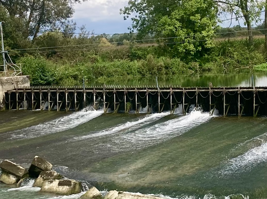 Half an hour later we were passing Fontaines-sur-Marne, where the canal passes close to the river. At this point there is a lovely wide weir down to a branch of the river that runs past Bayard. The river map here is quite complex!