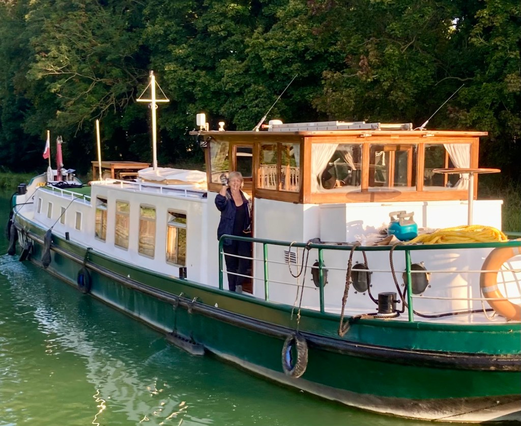 She is currently at Saint-Jean-de-Losne, 21170, France – but look through the blog to see her in all her many happy cruises, sometimes with friends or family.