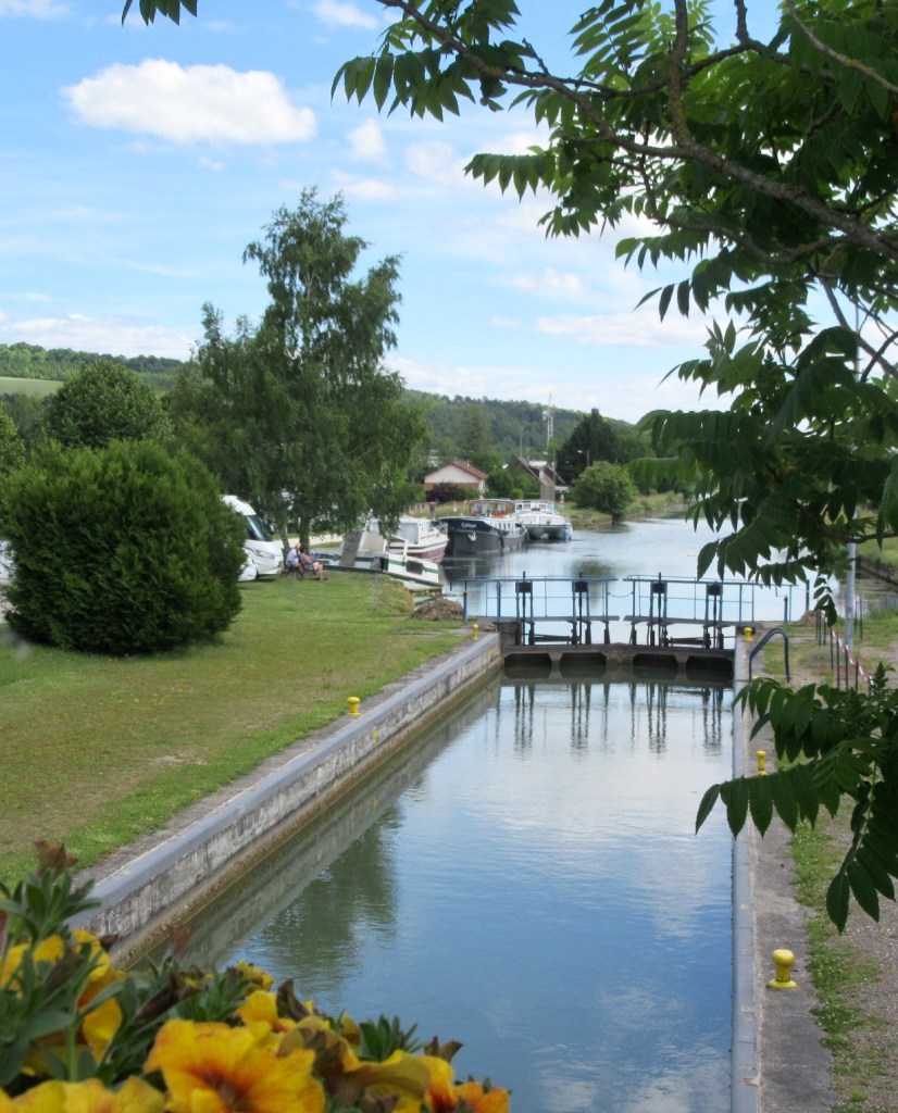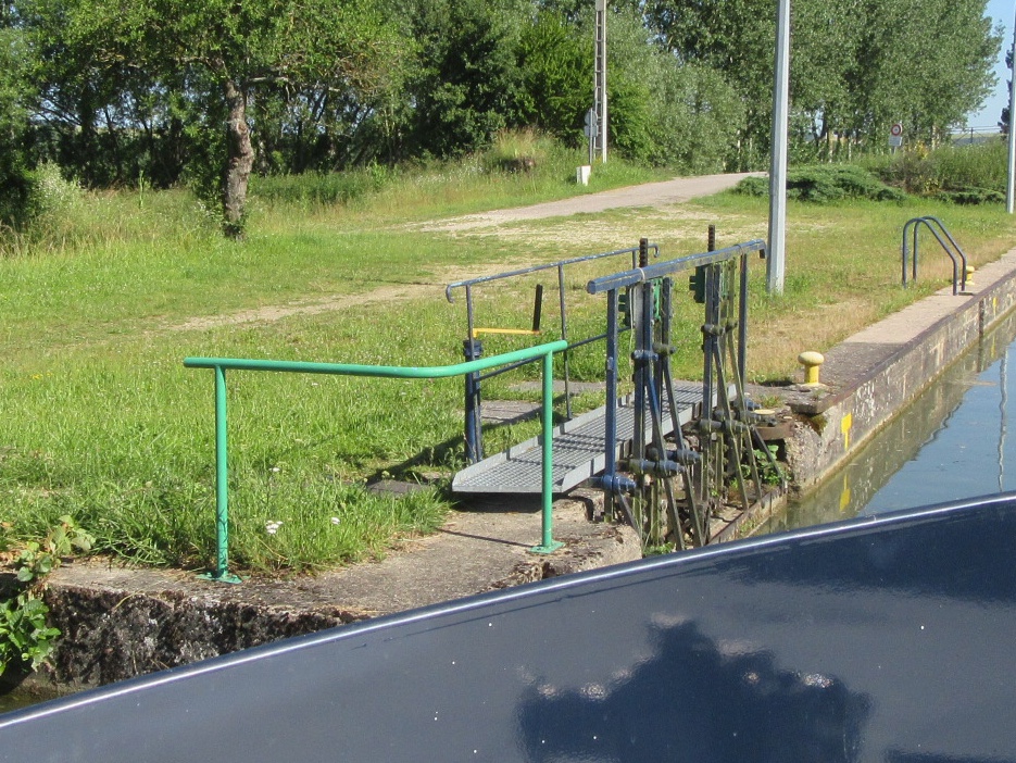 We then discovered something that we have not seen since the Yonne river, three years ago. The lock here has sloping sides and a floating pontoon to attach to during the locking process. It all seemed very modern, easy and tidy.