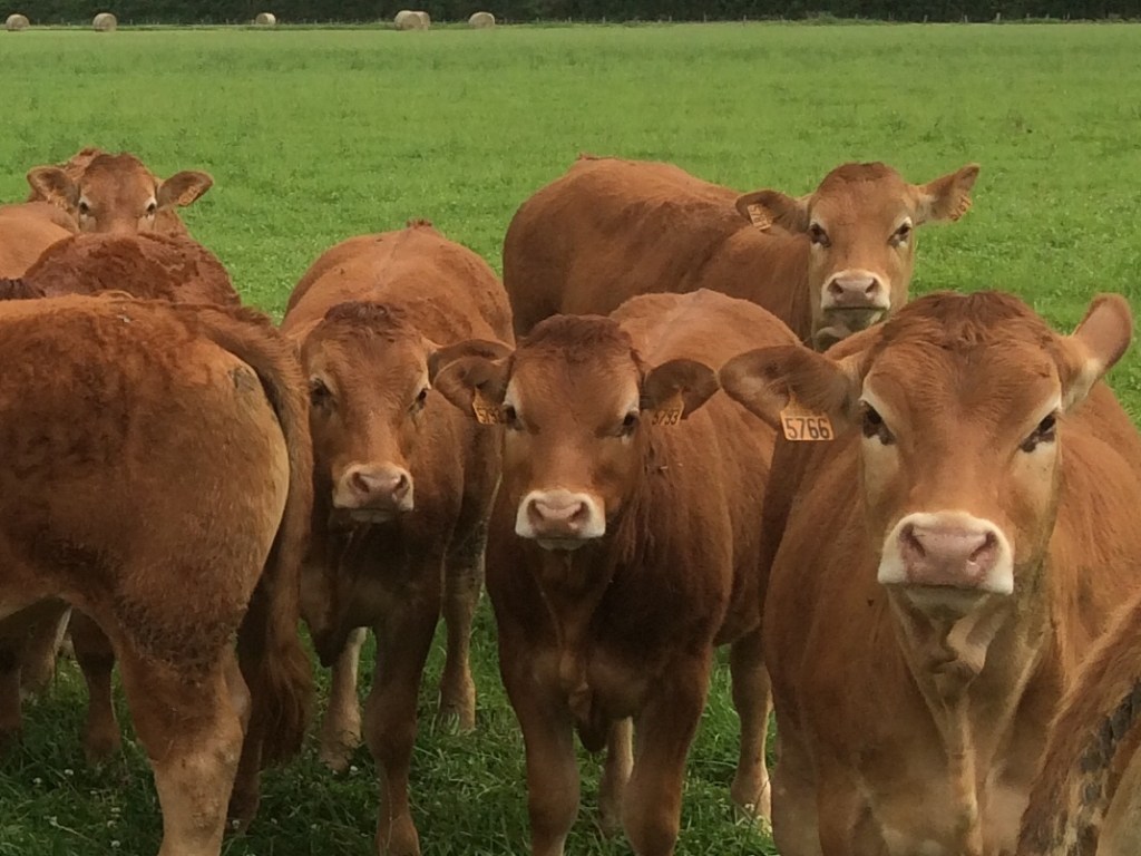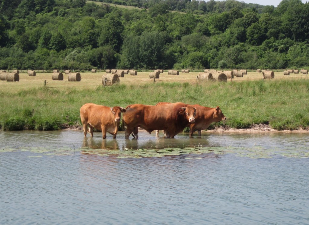 Before the afternoon was over I jumped on the bike and cycled off to the Intermarché while the skipper did manly things down in the engine room – a 9 minutes cycle ride from the boat according to Google Maps. After 25 minutes, much uphill, and getting lost twice I found it and hooray, they had fresh milk! It was on the way back down tracked between fields that I found the aforementioned cattle.