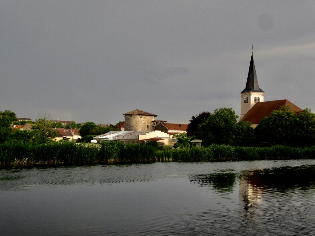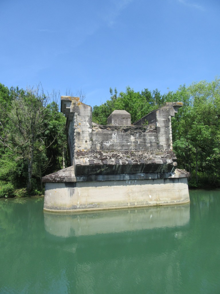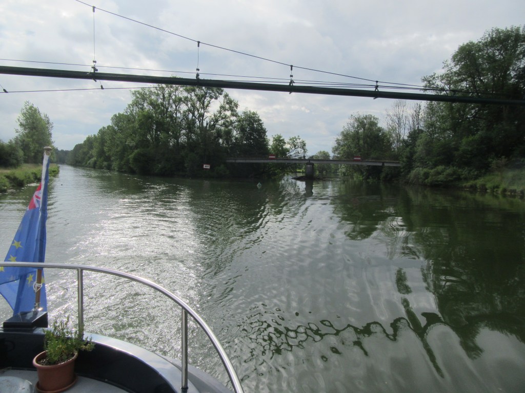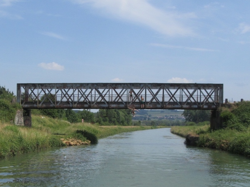 We passed storks circling in the sky (yes there is a stork up there), a church with a definite change of shape at Remilly-Aillicourt, and boys making the most of the hot weather by jumping in from a bridge over the (canalised) river.