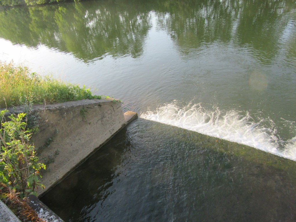 Stewart had a siesta. I went to find somewhere to swim, but finding a place to get in, or rather get out, of the river was not so easy. Eventually I found I could climb down next to the overflow from above the lock – delicious cool clear water to flump and splash about in!