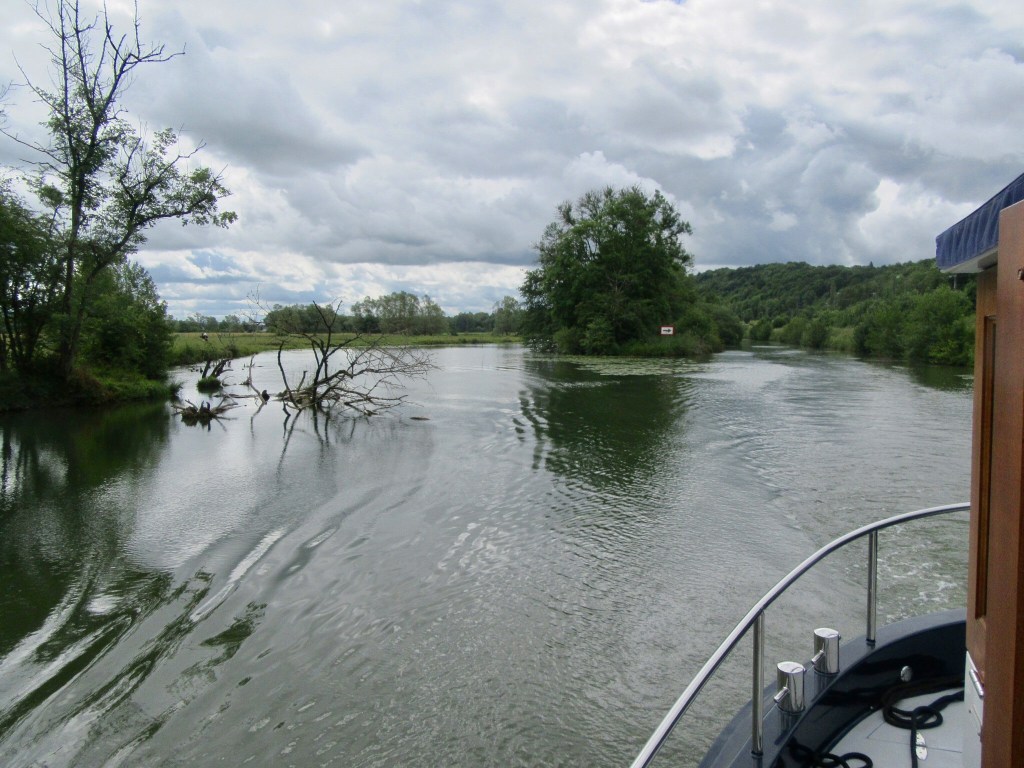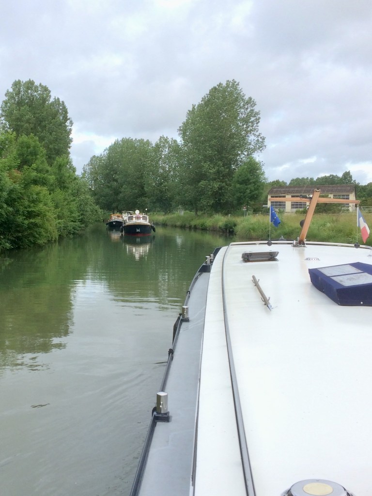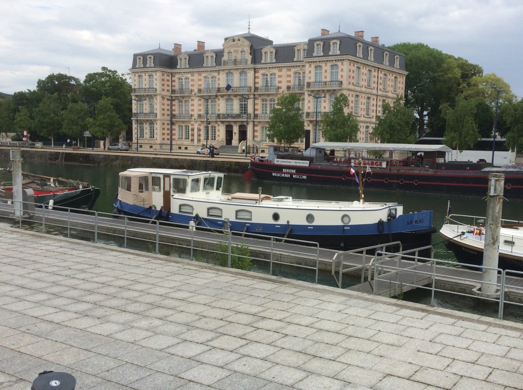 We had hoped to find a space in Verdun but the only spaces on the long pontoon were too short for Calliope. We did note another Piper barge, La Bas, on the pontoon, and they offered for us to raft up against them, but too late for Captain Stu to change course. It did have one good result – Patrice on La Bas took a photo of us as we passed on.