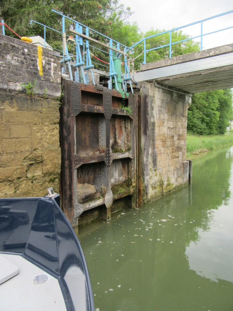 Luckily I was above the lock, waiting to walk the kilometre to the next one, so could easily go to the ‘Aide’ button and call for help. But poor Stu was down in the depths, and then it began to rain! No matter – within a few minutes the VNF Service van arrived and we were on our way – all the way to lock 3 where the upstream lock doors didn’t open.