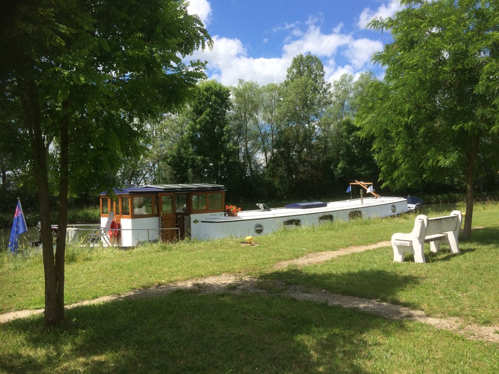 Eventually, after a long day for us – almost 30 kilometres in what was becoming a heat wave – we reached the outskirts of Stenay and were delighted to see that the mooring we hoped for, an old factory mooring opposite a small weir, was free.