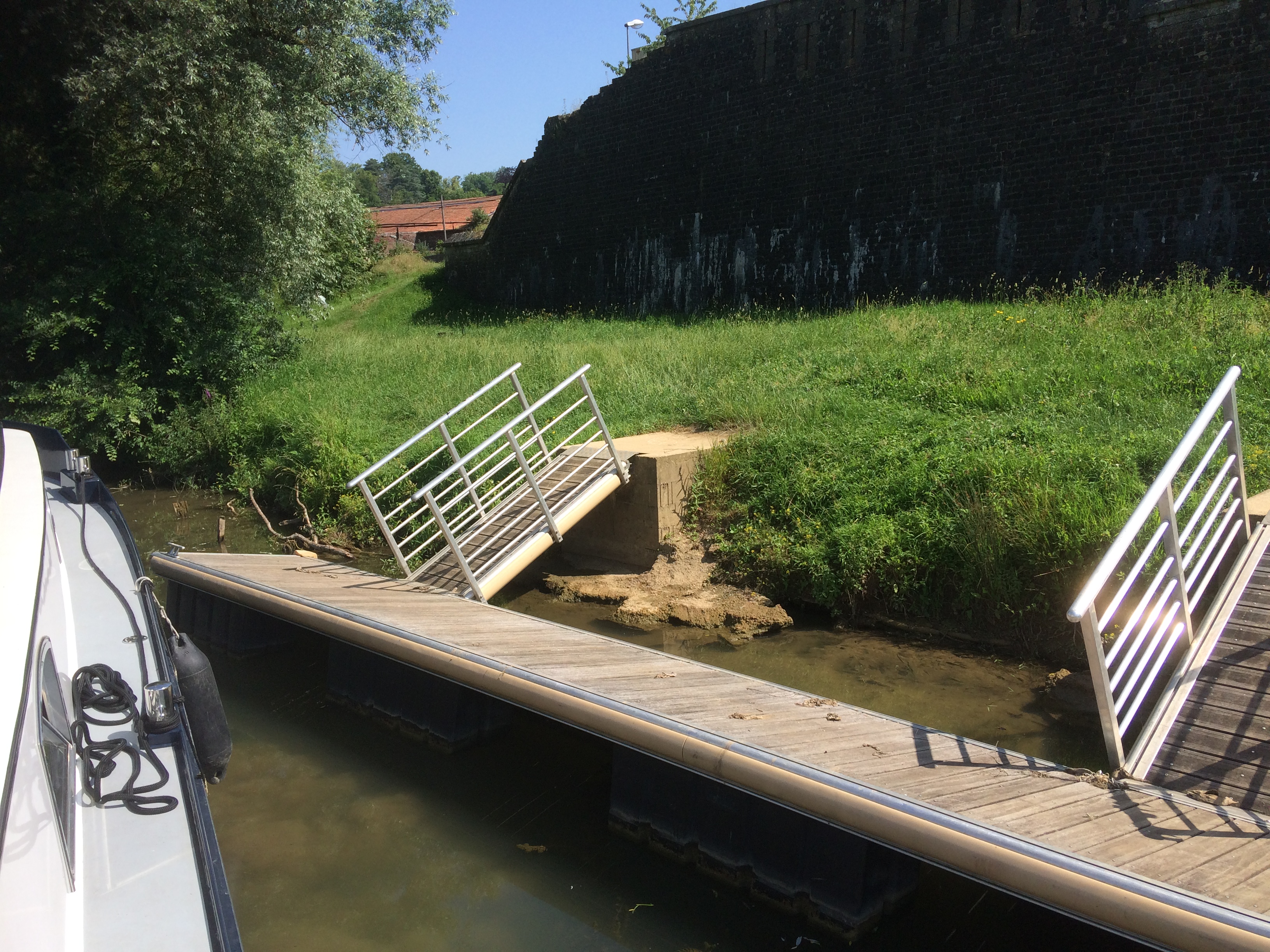 We stopped along the way for a little shopping (beer running low with all this hot weather). We knew there was a pontoon by a supermarket, but when we got there we found that it was at a very strange angle, due to the low water in the river.
