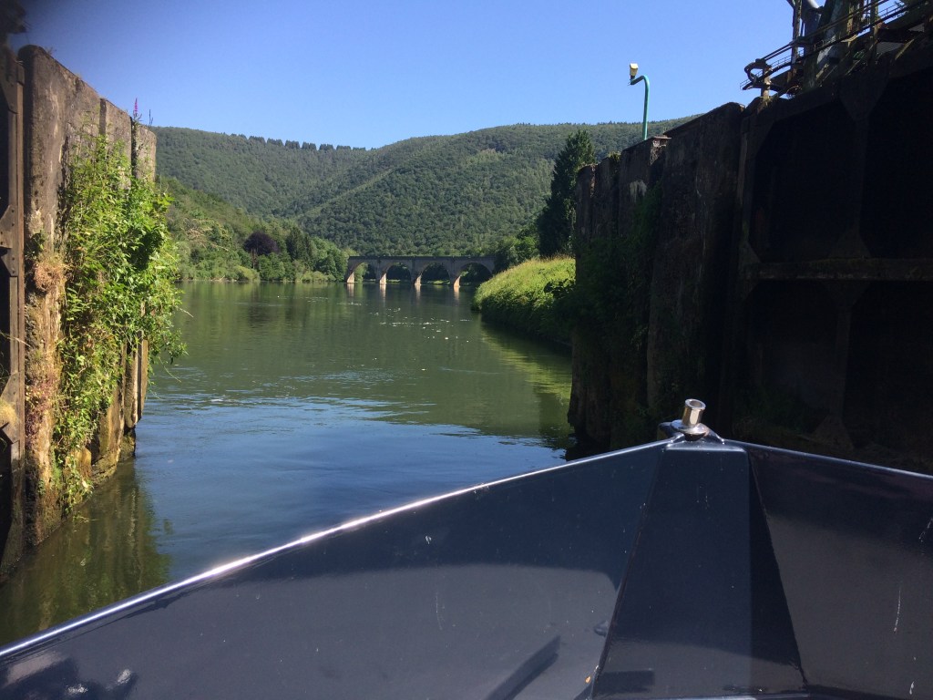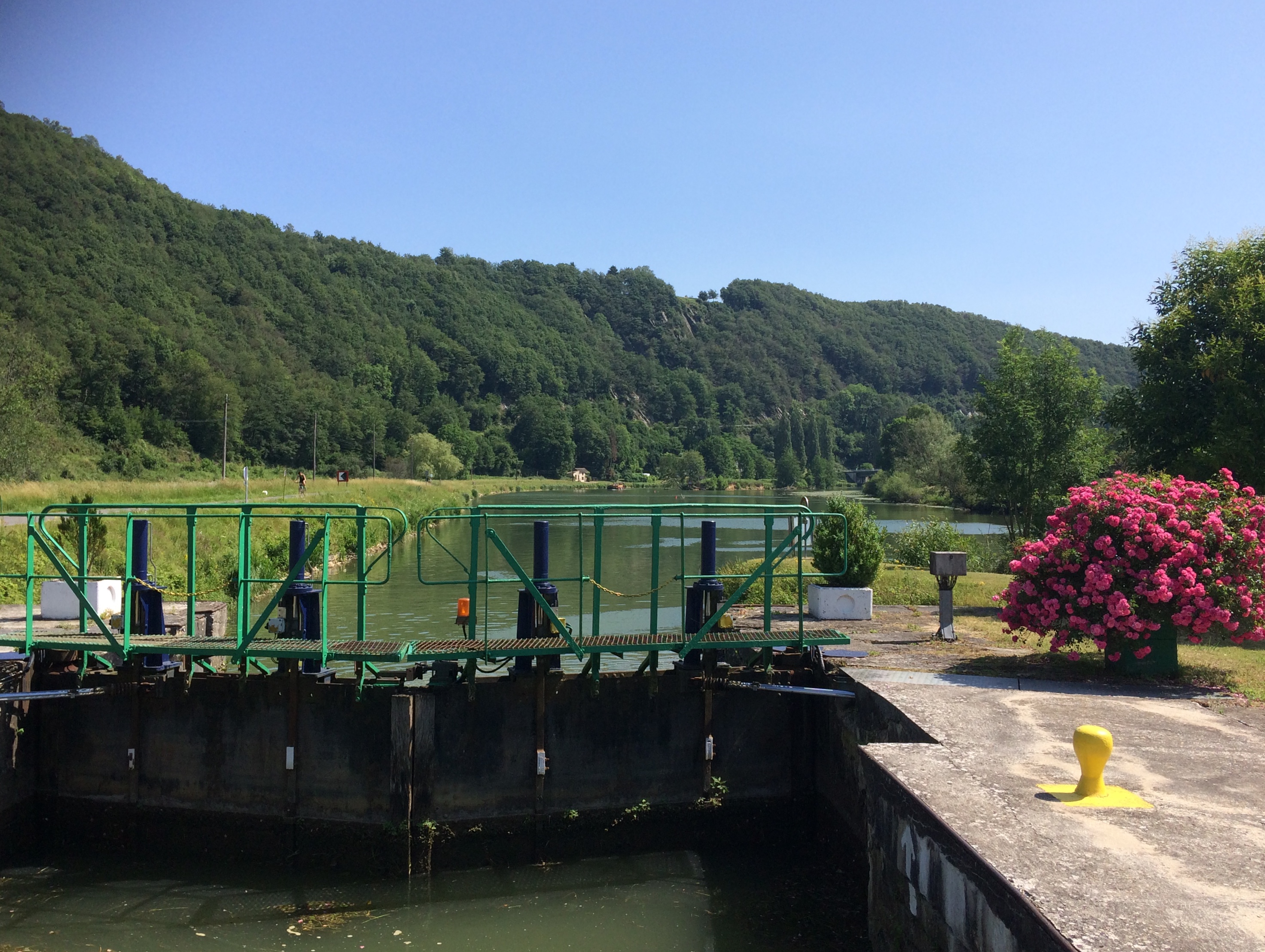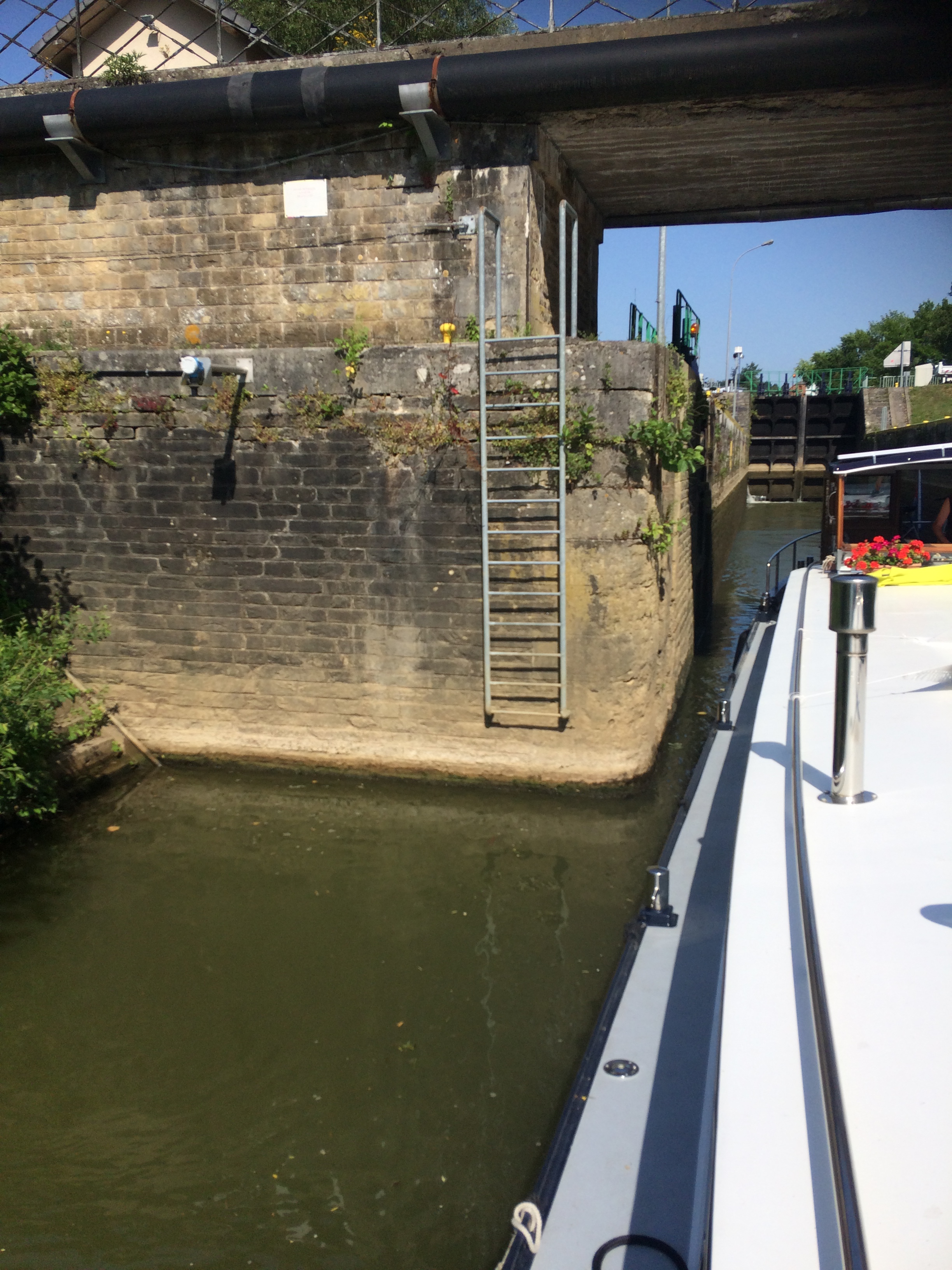 It was just a one night stop, setting off towards Chateau-Regnaut next day. The style of lock houses changed again, and we really began to notice the drop in water level in the river. At the lock on the photo above the ladder steps that should reach down under the water to help people get out, now end above the water level. Hope I don’t fall in!