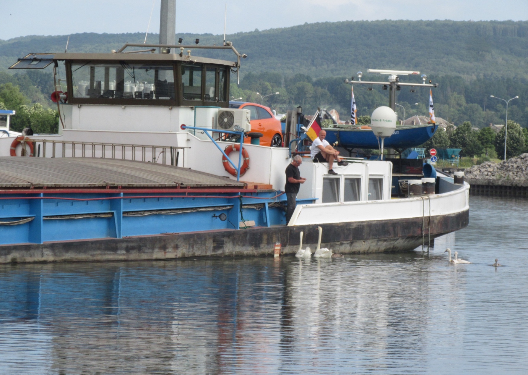 Next day saw another change. Suddenly we were amongst the big boys! Just down from Givet is the écluse named les 4 Chiminées. This has been brought up to European standards, so the large commercial barges can now come to the port there, loading, unloading, and feeding the swans!