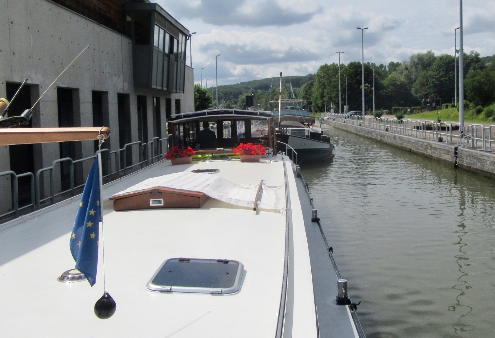 At Dames des Meuses lock there is an old pont-levée, seemingly always open, pushing its rusty metalwork into the sky, and just nicely setting off the Captains’s neat rope work.