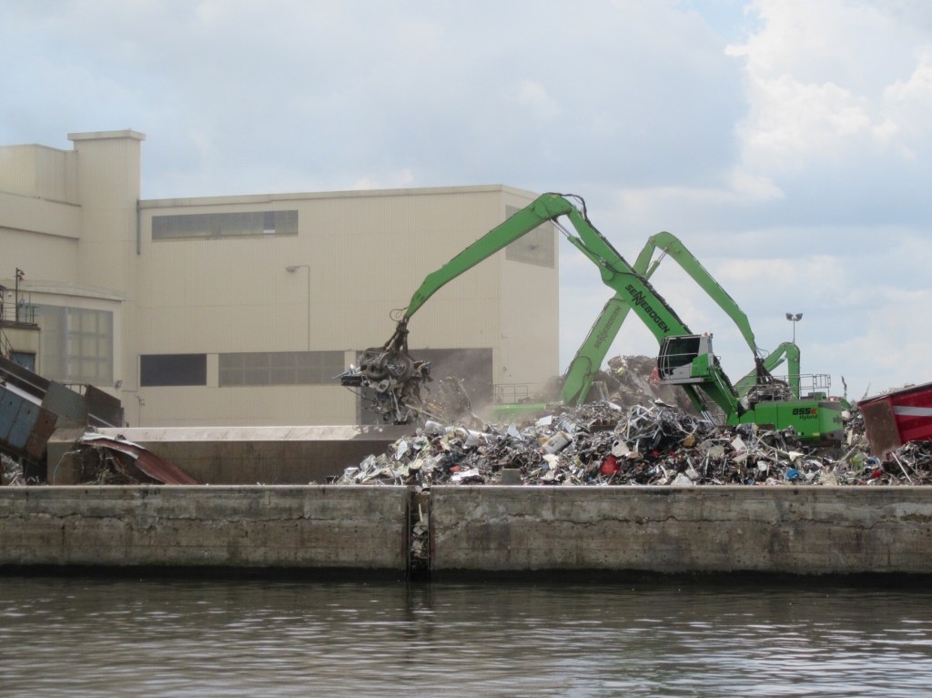 Our last section of the Canal de Centre was industrial again. Two green grabbers having fun picking up and throwing graspfuls of old cars, bikes, and unrecognisable metallic mess – it looked like someone’s birthday Red Letter Day experience!