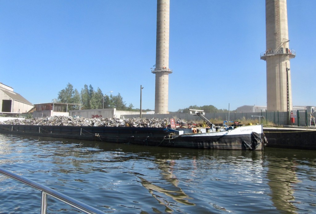 The journey was along the Sambre until we reached Charleroi where we turned à droite to join the Charleroi-Brussels canal. Moving through Charleroi was a sad shock to the system. It has had a huge steelworks history, pretty much now all gone. It has been replaced by a scrap metal industry with barges moving different size pieces off metal up and down the river, gradually diminishing in size from whole cars to glittering fragments.