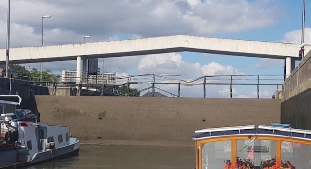 Now it was time to move a lot further downstream, to Liège. The days cruising only included one lock, but for that one we had a bit of a wait outside and then a bit more inside, as so often happens. It was all very gentle and pleasant, this time with unbroken railings on the upstream gate, and nice floating bollards to ease our descent.