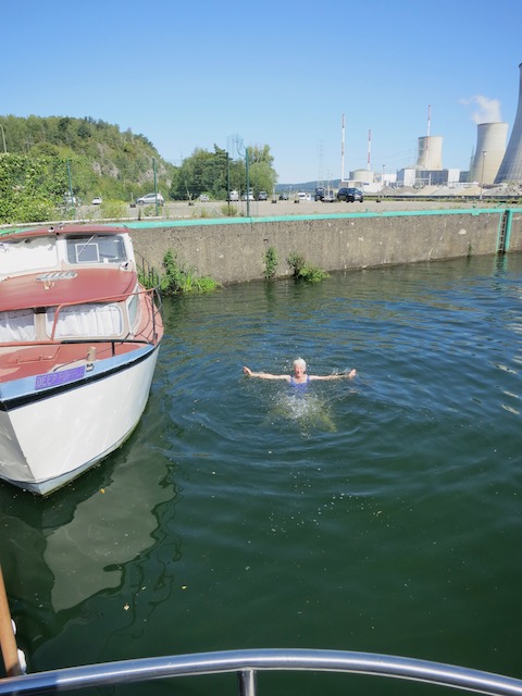 Then we were through the lock and cruising along the Maas, fully expecting to find a nice mooring in the shade somewhere. But it was not to be. After the full 10 kilometres of the river between Monsin and Visé, including the port at Visé, we found nowhere suitable.