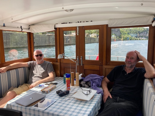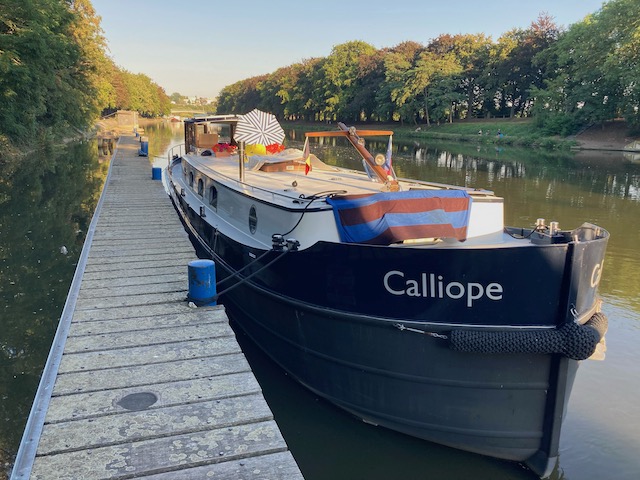 Evenings were lovely on the back deck, finally in the shade after hot hot days. Our mooring was at the junction with the Ourthe river, here disappearing South through a bridge.