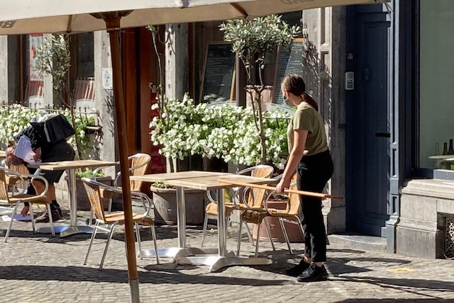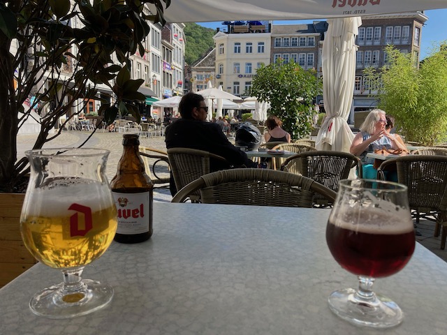 A last beer in Huy square before checking into the fritterie on the quayside – most excellent!