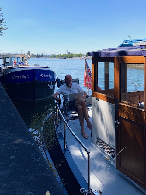 Our next move, a little further downstream, was to moor up to a high quay in the lea of an island. This gave us some protection from the wash and turbulence of the big commercial barges ploughing up and down the river.