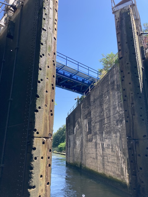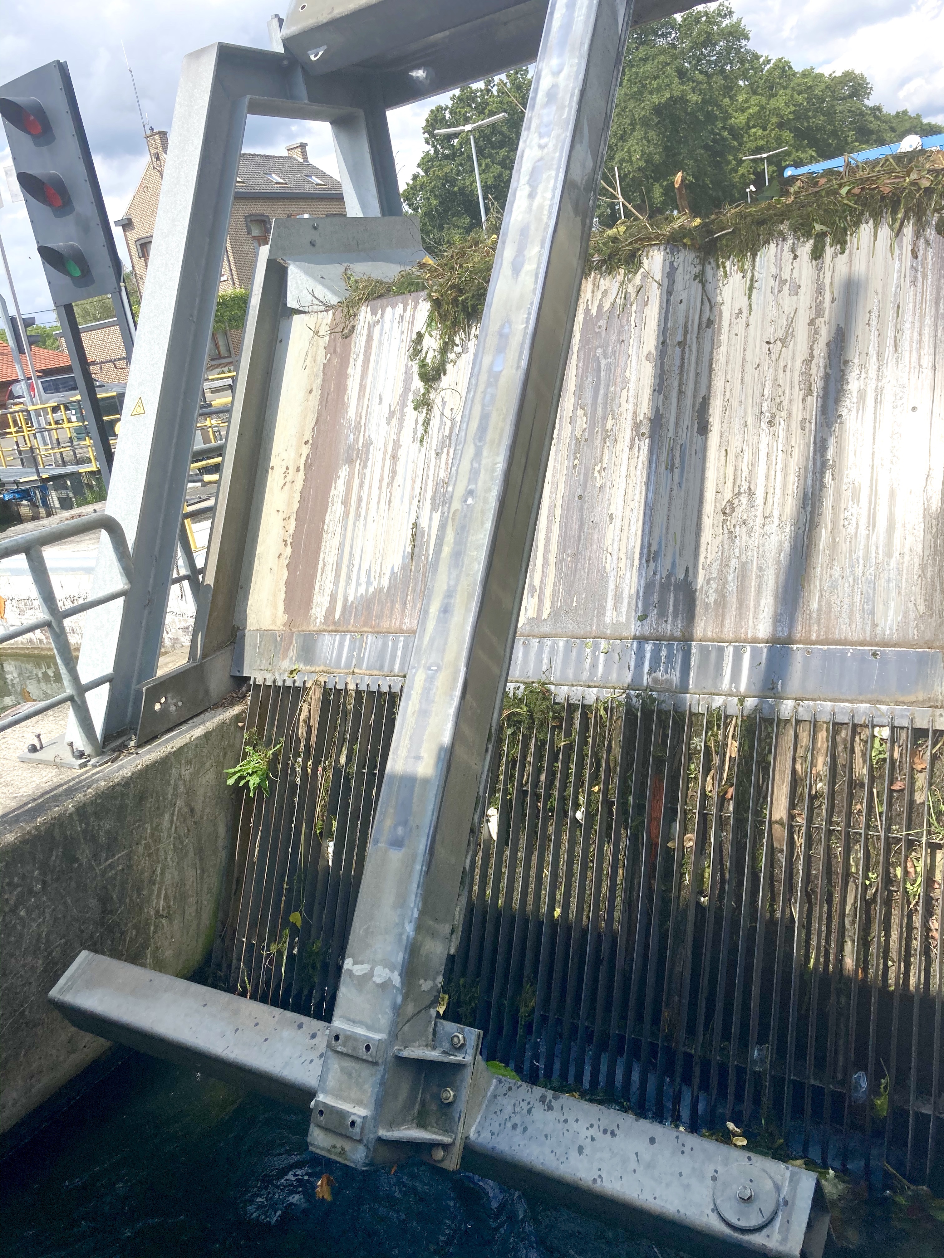 I’m going to interject a technical note here because I was so impressed by it! Apparently it’s not at all unique, but a first for me. At the side of the lock was a sluis allowing all extra water to whoosh through, with all accompanying debris caught on a grid – except that this machine periodically scoops it up and puts it into the adjacent skip! Love it!