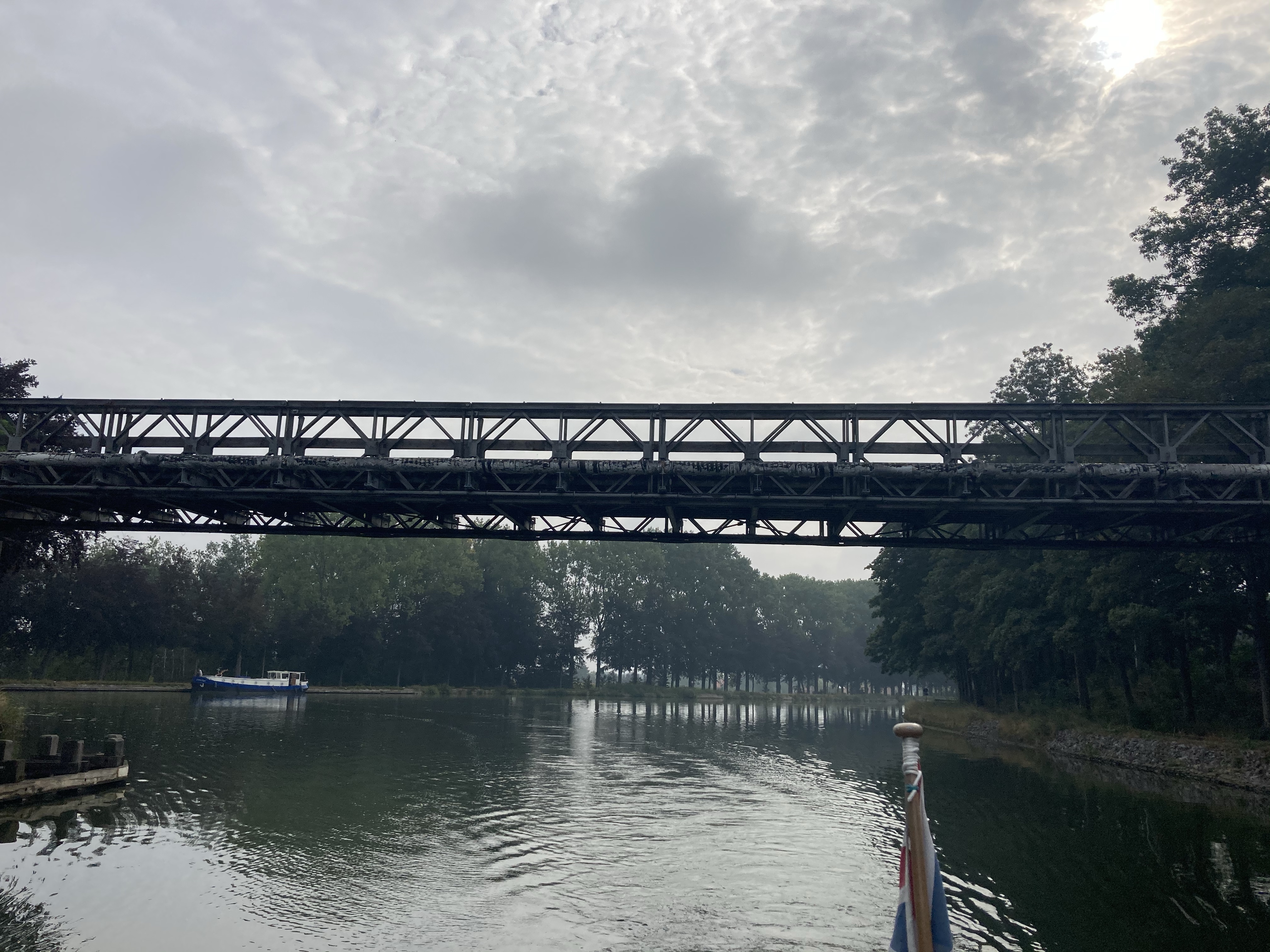 Next morning it was our turn to go under the Bailey bridge and on along the straight misty canal.