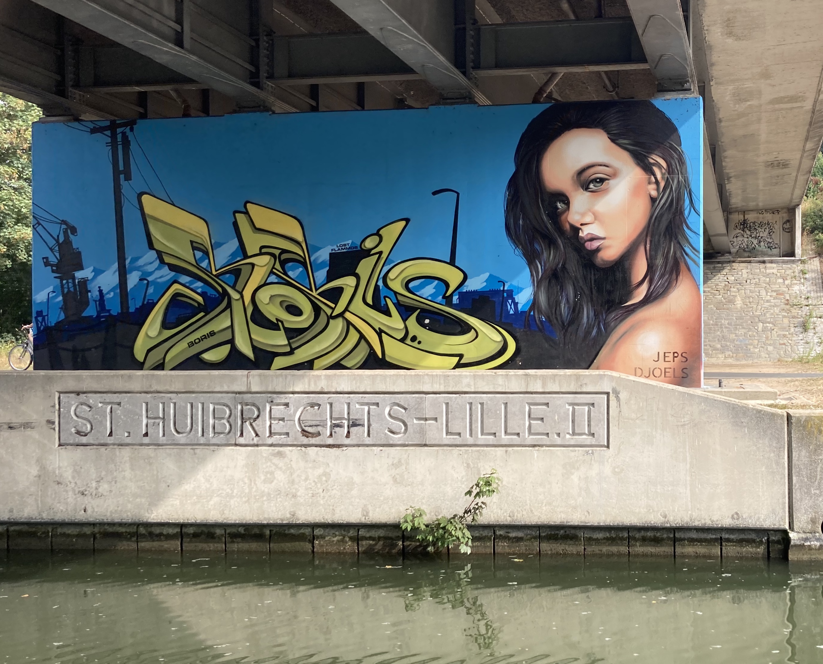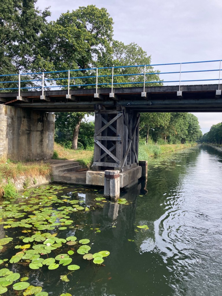 Three things caught my attention as we cruised gently along. All along these canals near the Netherlands border are ‘pill box’ type buildings with slits for guns to guard the canals during the war. On a lighter note we’re the graffiti style artwork under each bridge, and the way the bridges are named.