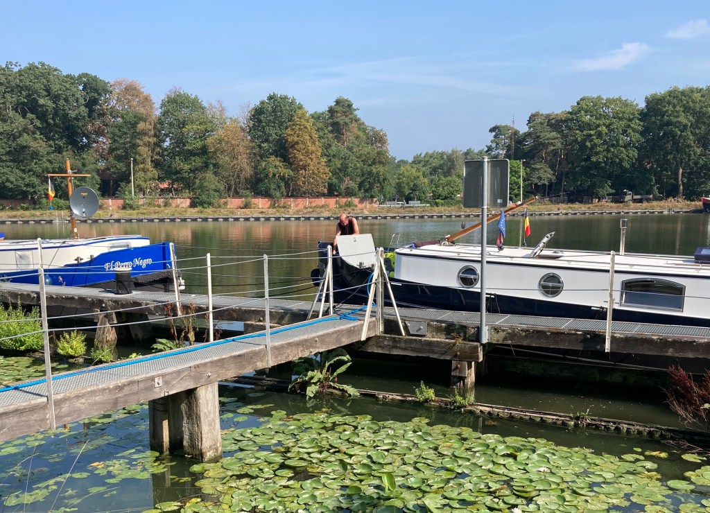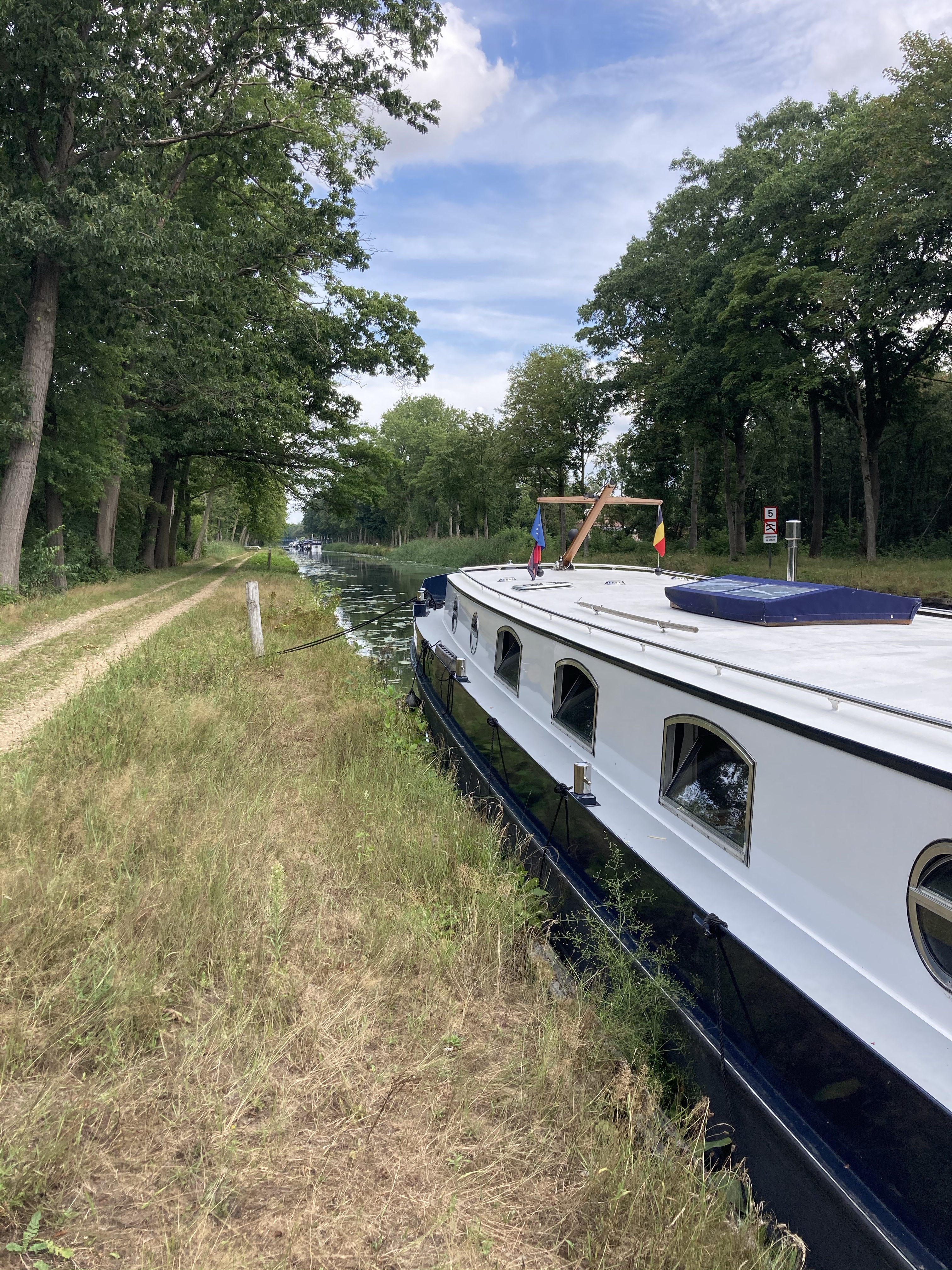 We had more than half a plan to get to Blauwe Kai, a big basin at the top of the Beverlo canal, and moor up with El Perro Negro, but 5 kilometres beforehand and right on lunchtime we saw other friends on Dreamer in a neat little cutting, looking very rural. Frans came out and immediately started his engine to move up and make room for us! It’s the power of WOB (Women on Barges) friendships that does it.
