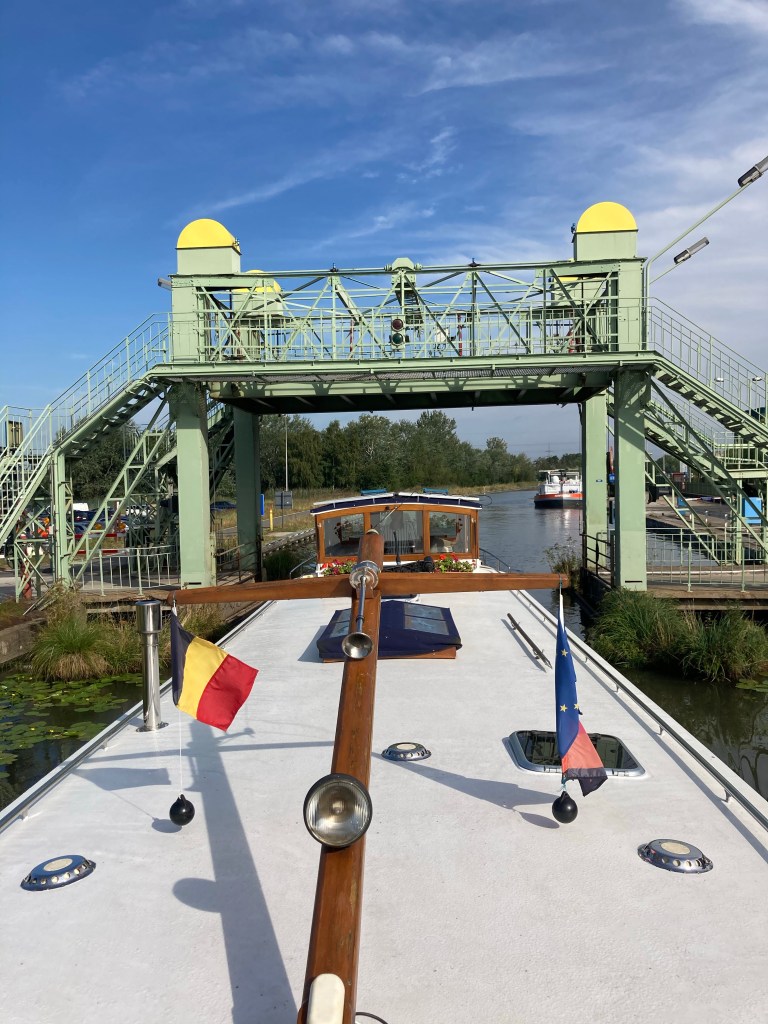But all was well. On questioning a nearby fisherman I discovered that he had had to move off the water pontoon and was now ‘round the corner’ at the top of the Beverlo Canal. I climbed the bridge – another Bailey – in time to see a long commercial barge carefully negotiating first the bridge and then Calliope!