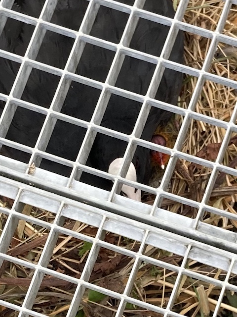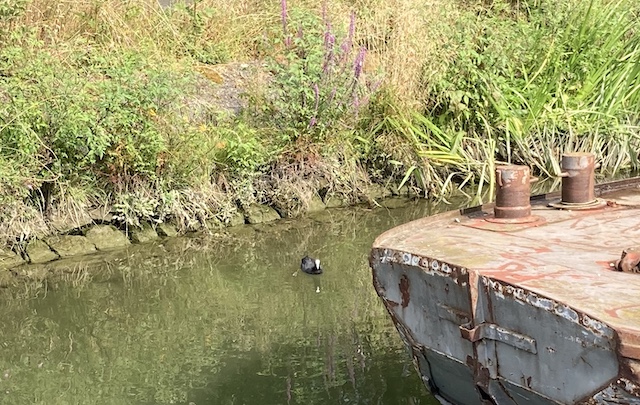 A pair of coots had built their best on one of the wooden supports to the pontoon, directly below the metal grid, which was extremely hot to the touch in the 36 degree heat. And the eggs began to hatch – here is one little coot with mum, while expectant dad swims about nervously.