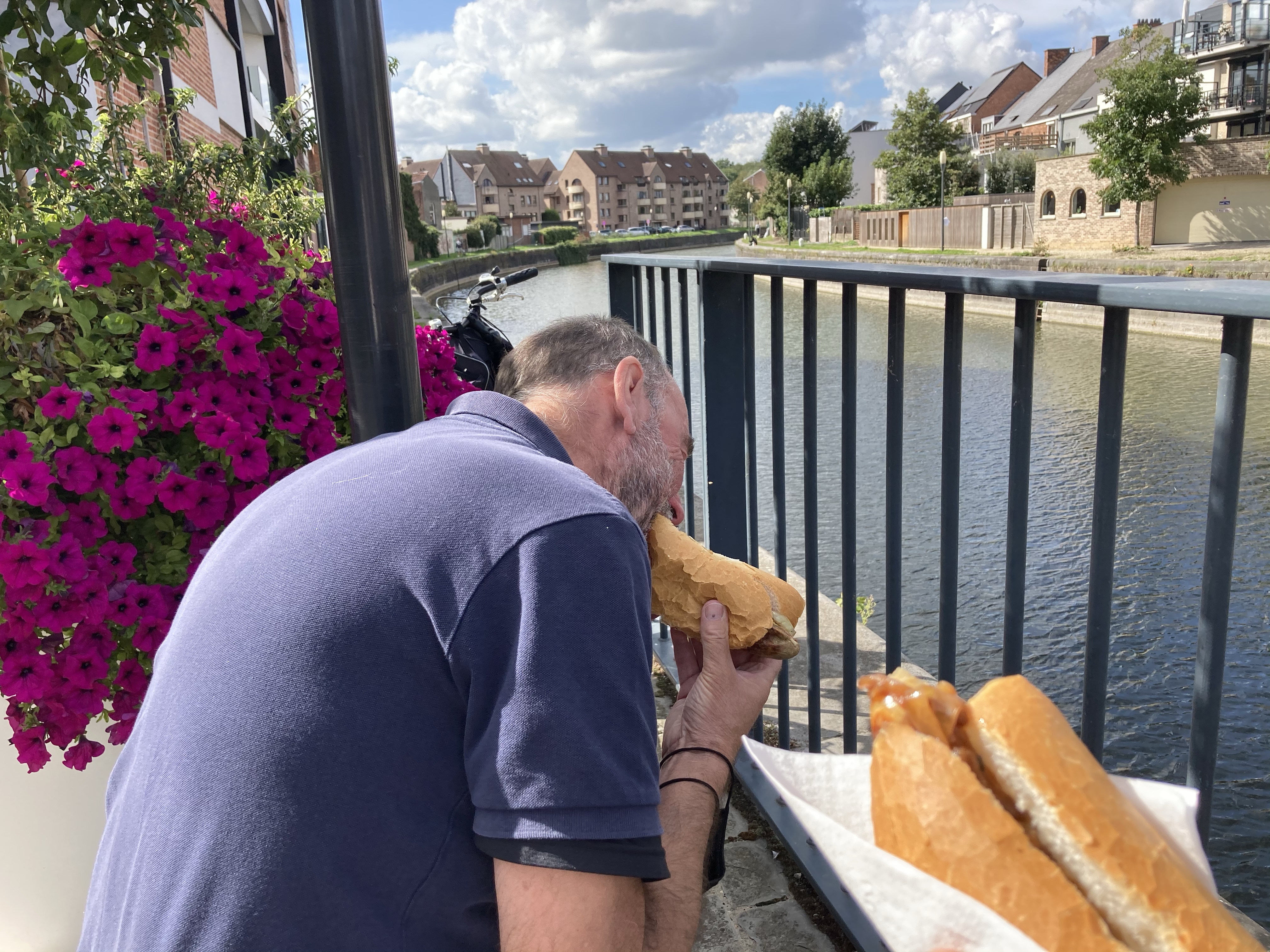 Monday was a lovely autumn day. We walked down the old Dender into Dendermonde and found it was market day. In addition to buying one or two essentials we bought yummy hot dogs and sat down by the river to eat them listening to the carillon from the local church.