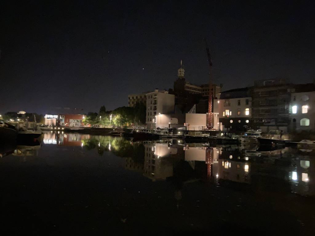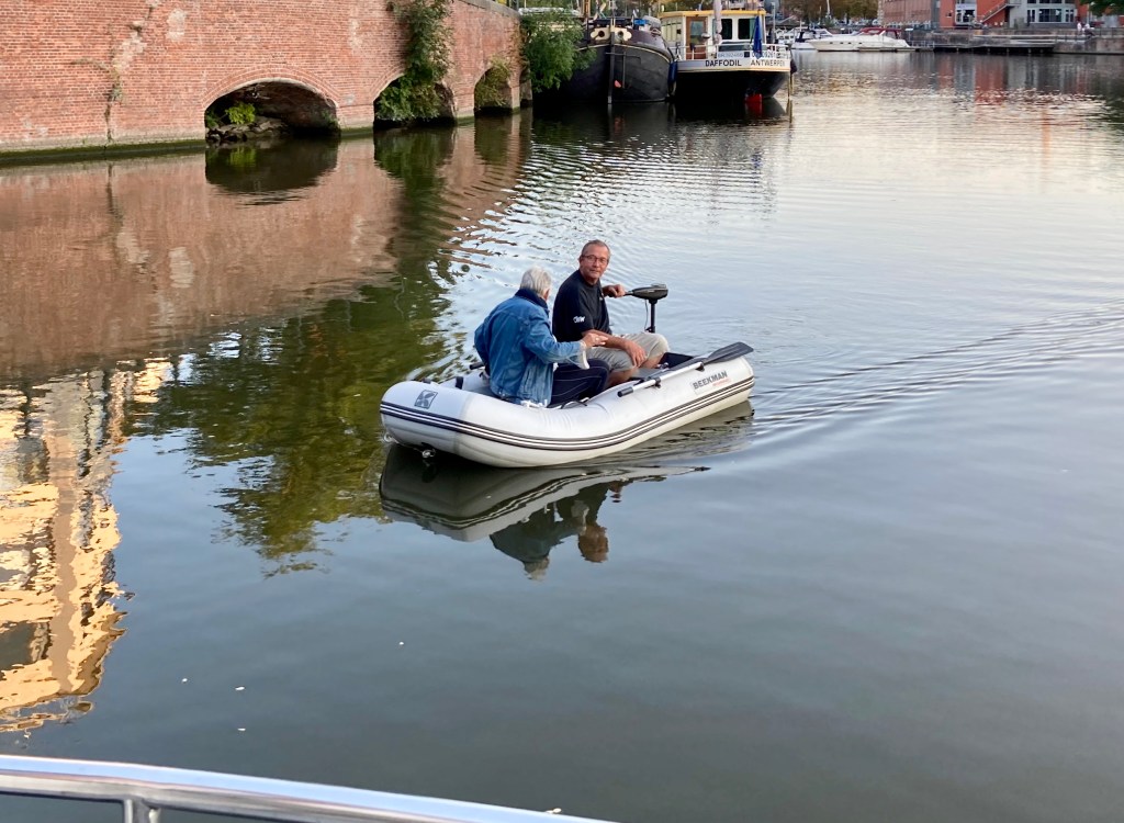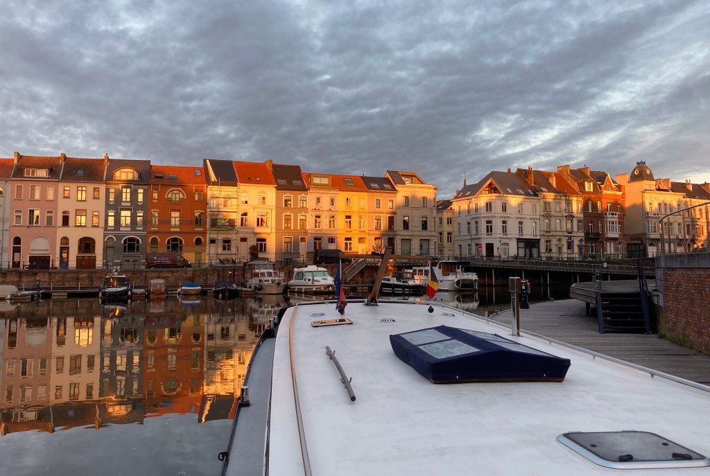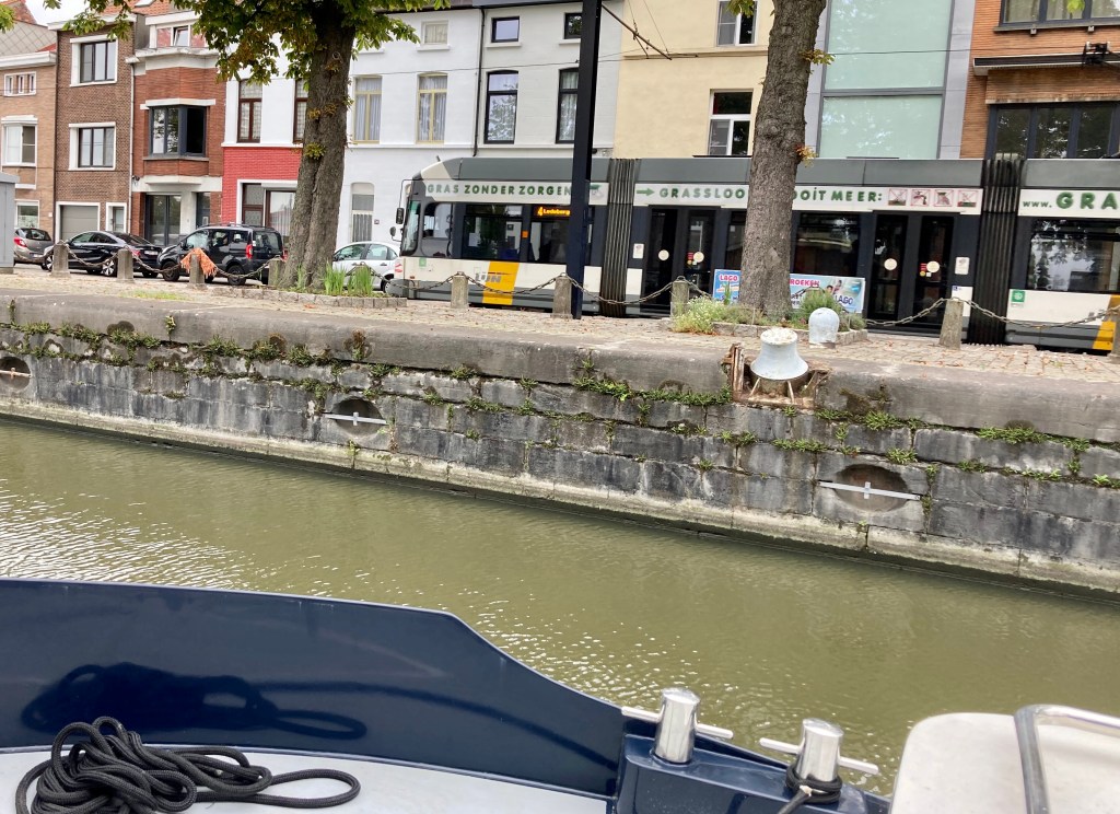 We continued round the Ring Vaart – the waterway ‘ring road’ of Ghent – until we reached the much smaller Brugse Vaart where we had decided to turn off and head into the city – only to discover our progress suddenly arrested by an unmarked mud bank caused, as we found out later, by the wash from the large commercial vessels powering round the corners to Brugge and Ghent Seaport. It wasn’t a big issue though, as the bow wave from the first commercial gave us enough lift to reverse off the bank and back into free water.