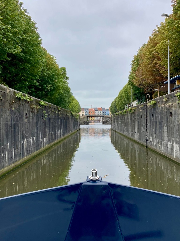 It took less than 2 hours to reach Merelbeke lock, whizzing along at up to 14 kph at times and almost twice our normal cruising speed. The voyage was fine though – we passed interesting looking small towns, a few commercial craft from large barges to small ferries, and plenty of countryside. If you get the tides right there is nothing to fear from this trip.