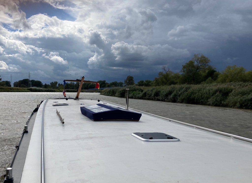 We were not going far – just 5 kms to an area with several mooring options. Along the way we crossed paths with one of the stranger commercial barges – one transporting containers of stinking refuse, driven from the front, and with twin hulls.