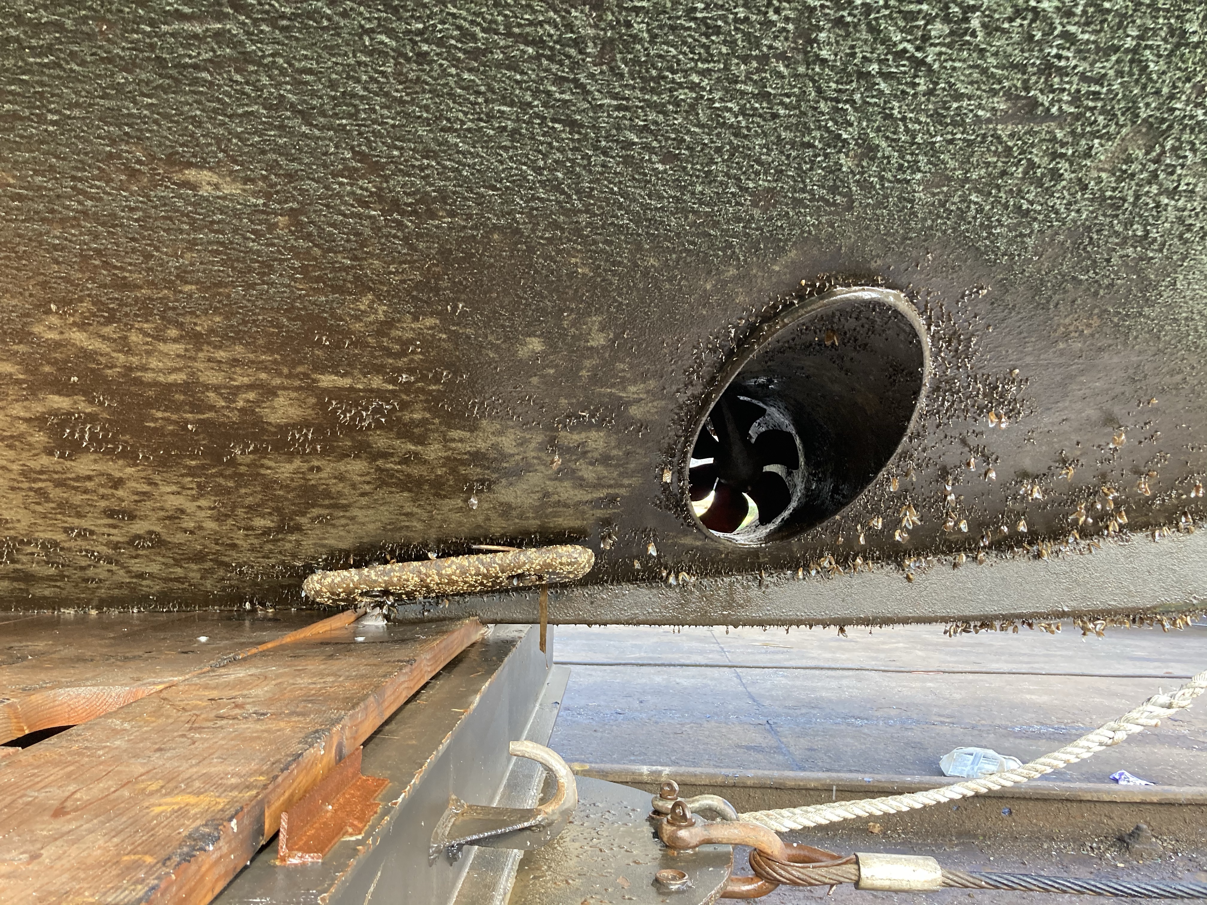 A quick inspection showed an intact bow thruster, 6 be-barnacled but solid anodes and a ‘gift wrapped’ propeller.