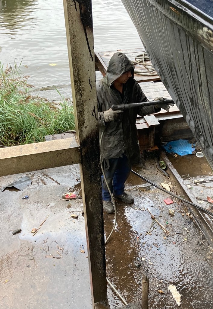 Then, on a wet windy day, came our turn for work to start – the pressure wash, to remove the relatively small amount of weed, baby mussels and tiny barnacles. It felt strangely exciting!