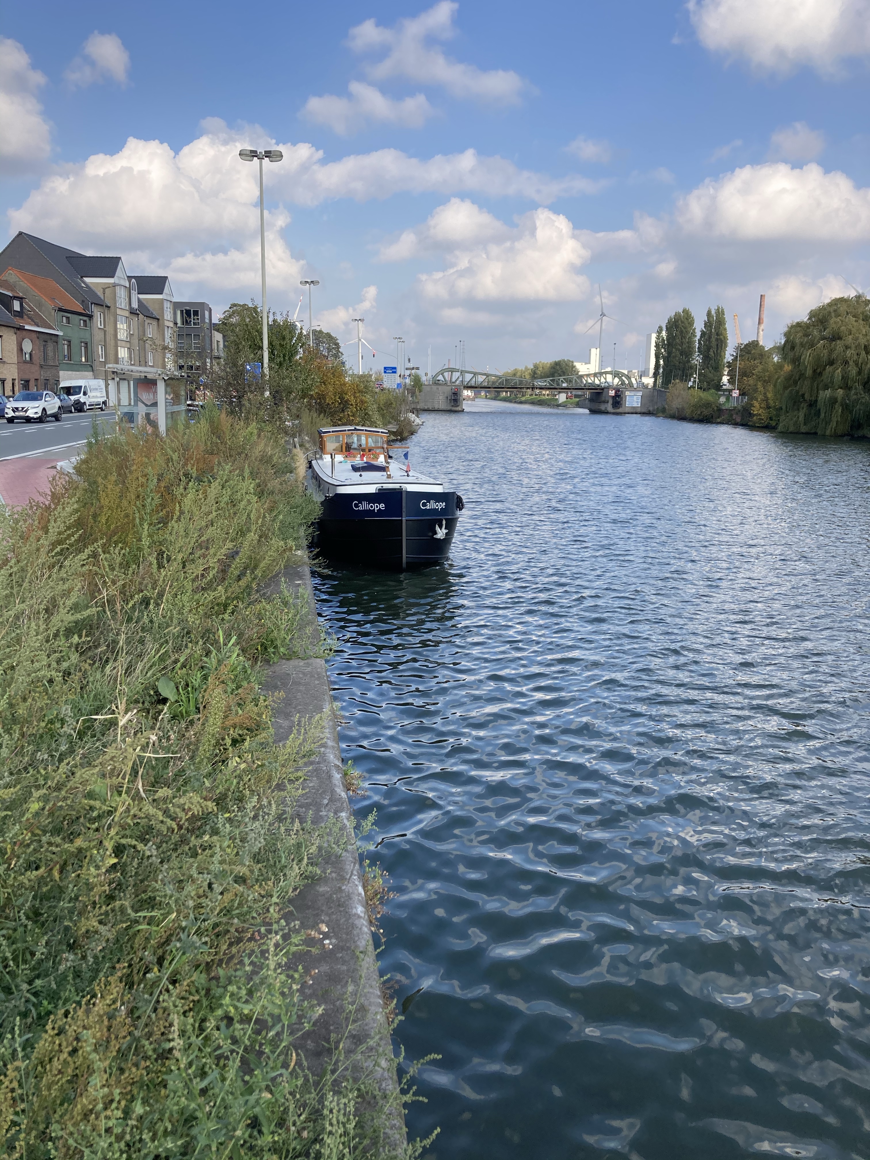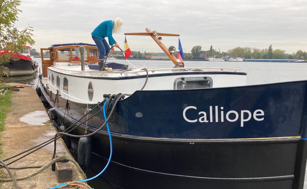 Here are two happy Calliope crew – we’re back on the water! We are on the big Gent-naar-Ternuezen Kanaal, and enjoying every minute.