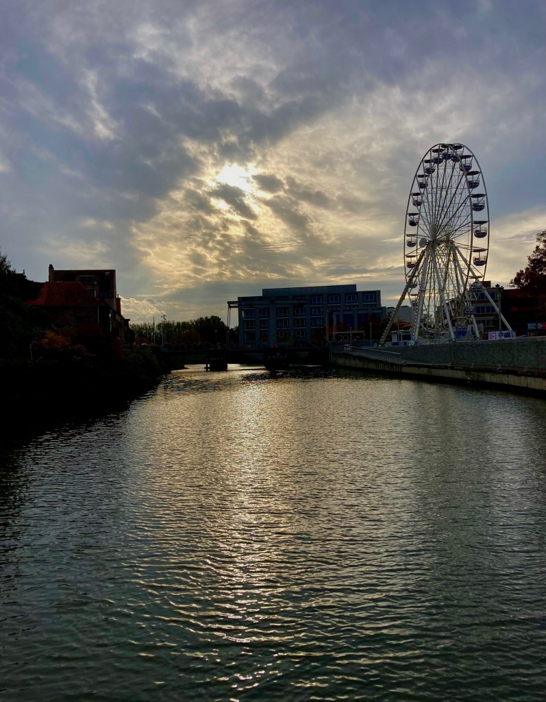 …. and a ferris wheel next to the church. looking glorious as the sun began to set. It seemed to be there for half term and was going to bet going the following night. We would miss it – “shame”, said the Captain!