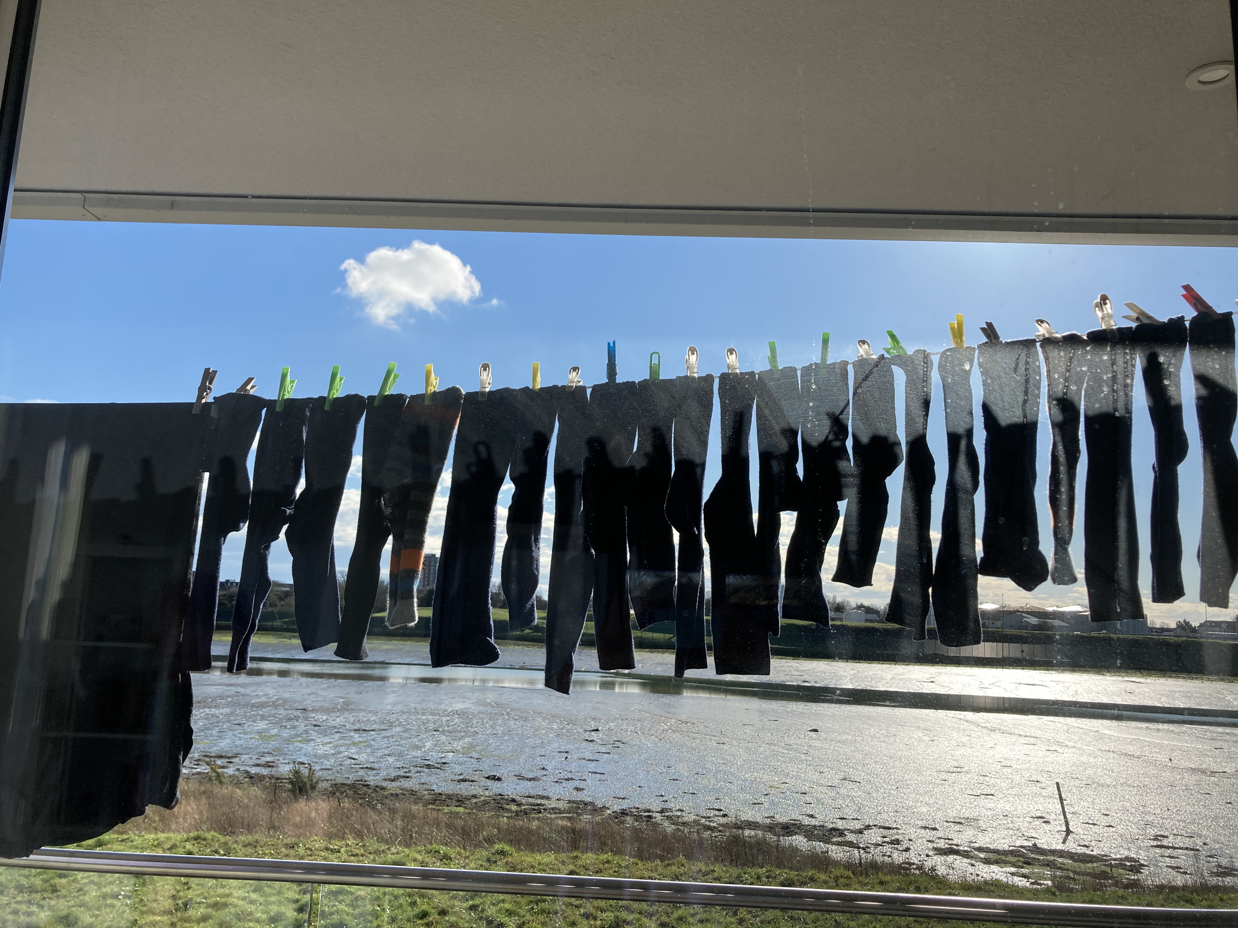 In February Stewart fixed up two of the things I had been missing most in a house with no garden – plants to care for and an outdoor washing line. These were both erected on our little balcony and both gave me great joy and a feeling of outdoor living again – while we waited for Coronavirus to pass. And even with this you will detect a background of water – we don’t ever seem to get too far away from sea, river or canal!