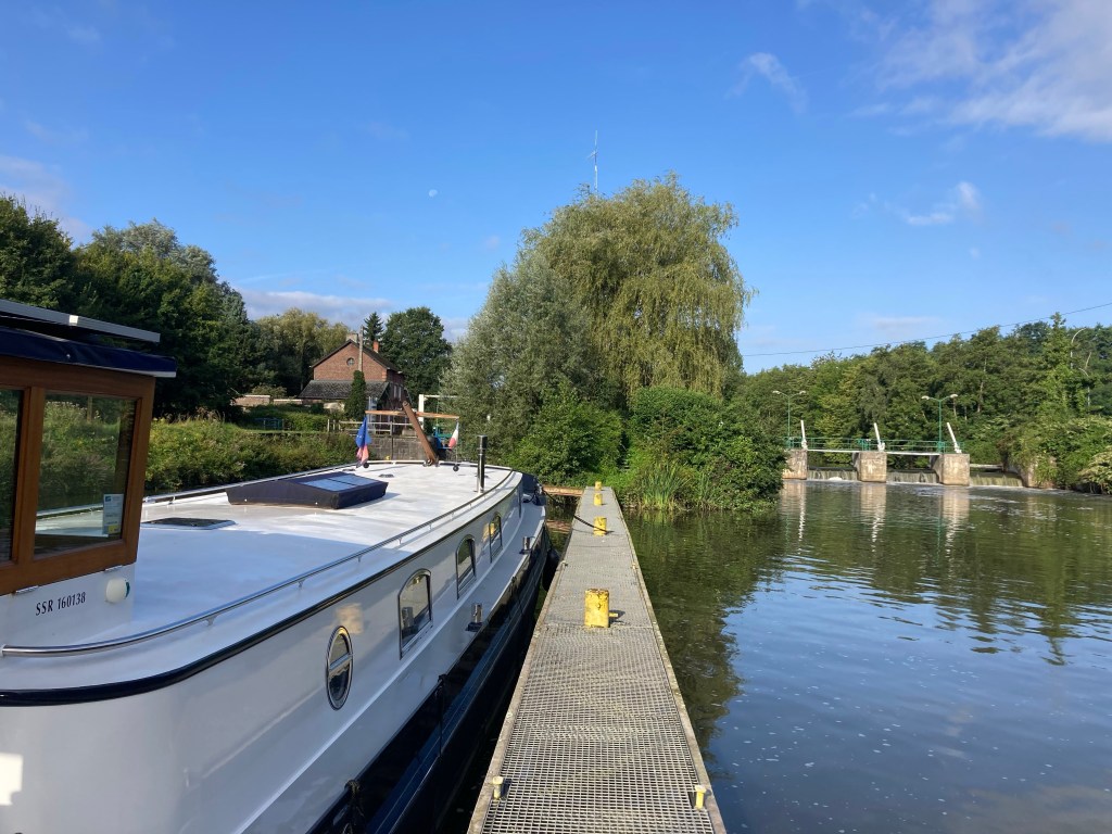 At Quartes, below the small town of Pont-sun-Sambre, we spied the waiting pontoon for the lock – ideal! We stopped for lunch to try it out, and with no other traffic on the river needing to use the pontoon I phoned the local VNF office to ask if we could stay there for the night. Bien sur! No problemo!