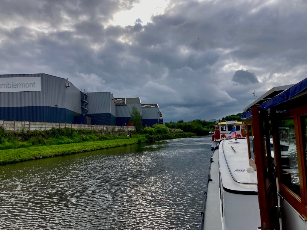 The view up river from our Hautmont mooring was industrial, but also dramatic as clouds rolled in that evening.