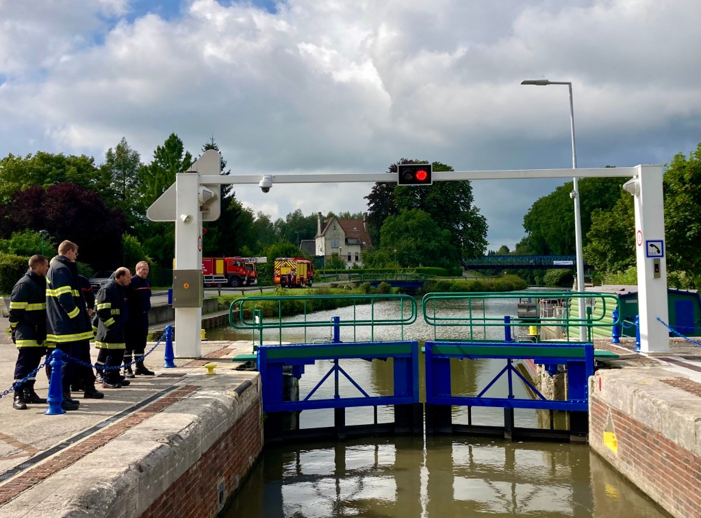 Captain Stu and I were surprised to find a traffic light system in operation at the next lock, and to see it with a double red light – which means ‘en panne’, or out of order! And as we drove towards it we could also see a fire engine, another emergency vehicle, and lots of pompiers (firemen) looking onto the lock. Had there been an accident?