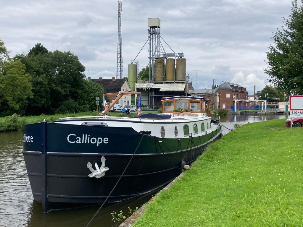 We were heading for Hautmont and its modern port. That meant another two locks and 18 kms – a good morning’s journey. The lock at Hautmont has an interesting approach, round a bend, under a bridge, and with a weir stream kicking Calliope to one side! All was managed perfectly by the Captain at the helm.
