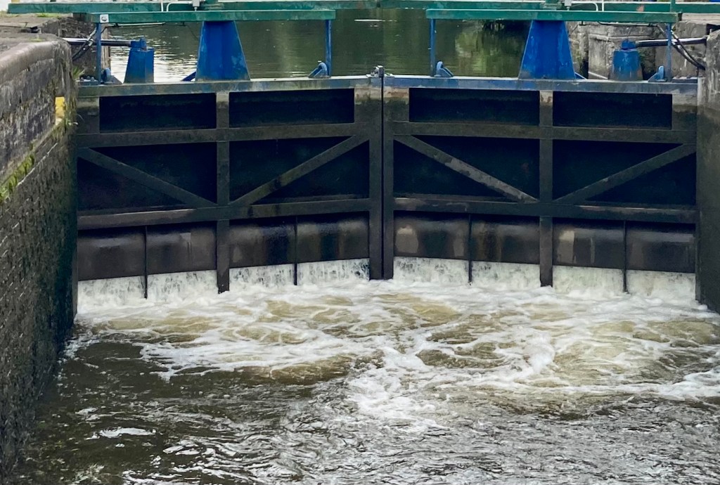 This is probably a bit geeky of me! But I love locks and all their differences. This one has 8 rounded ‘shutters’ in the gates that gradually lift, allowing more and more water in. Maybe both the other two rising locks on this section will be the same ……
