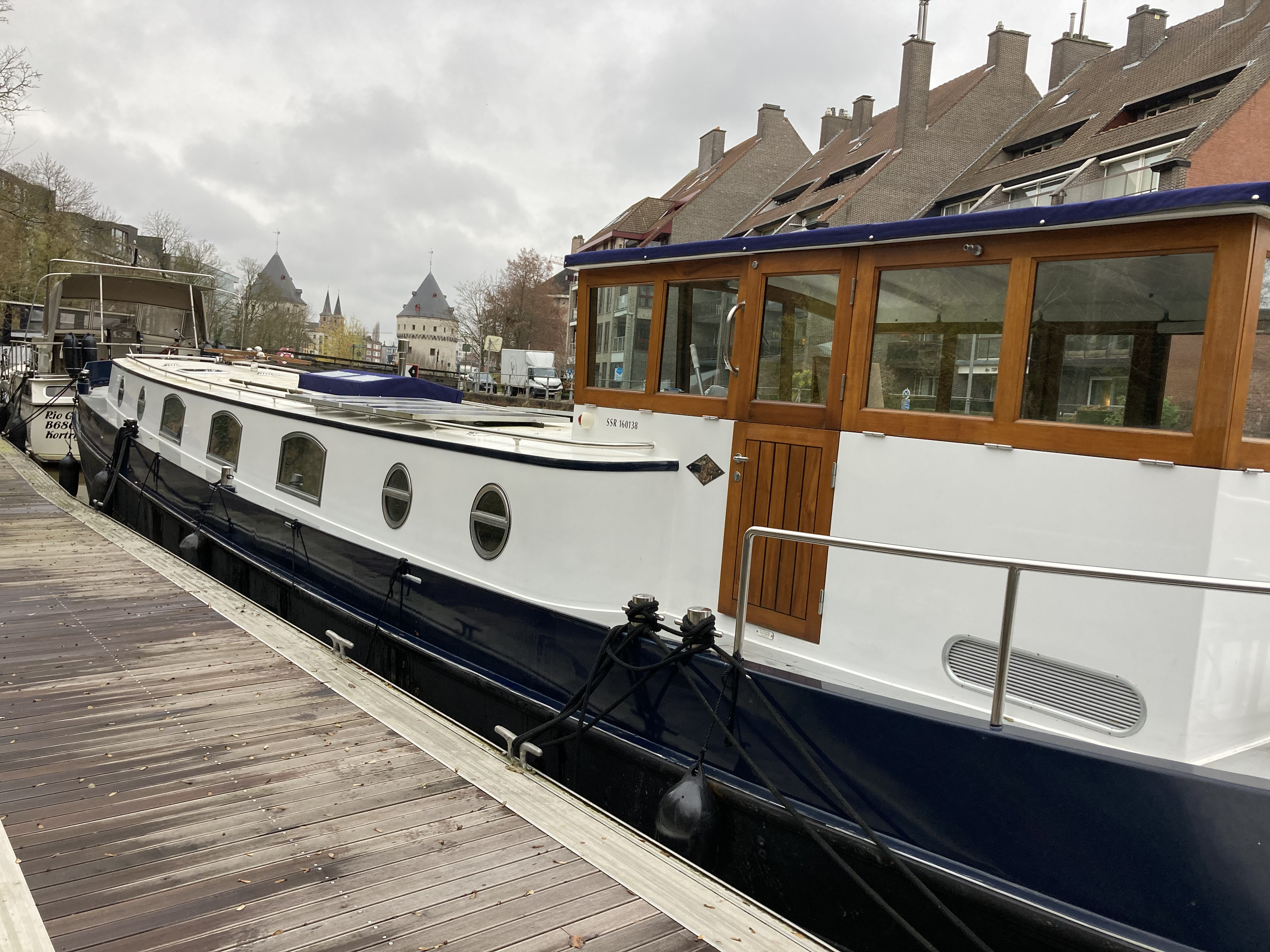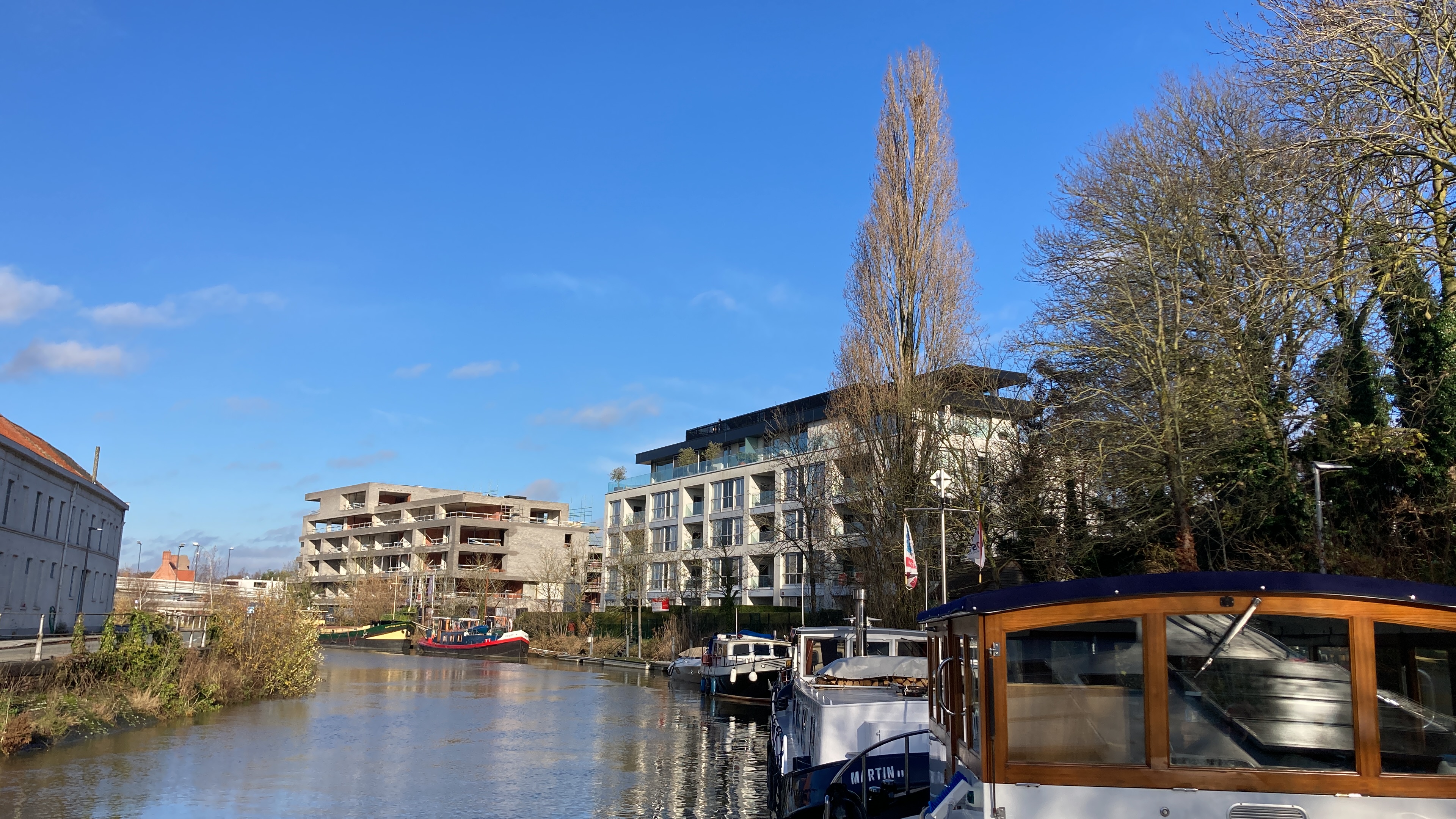 It’s a good straightforward drive from Dunkirk to Kortrijk – one of the many reasons that we like wintering there. We enjoy seeing Ypres as we go round it, going over the Ypres canal that we cruised down a couple of years ago. And we enjoy coming into Kortrijk, driving through roads that are now familiar as we approach the mooring.