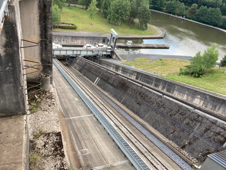 The plane replaced, in the 1960’s, a series of 17 locks that took the canal slowly up a wooded valley – very beautiful, but also very slow for the working barges that were using it at the time.
