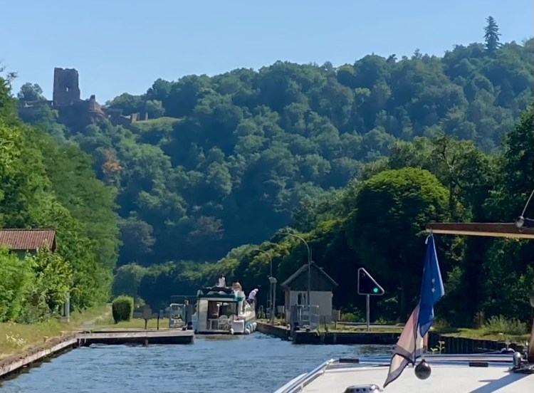 The canal leading out of Xouaxange was narrow and on a long curve, following the line of a hill; lovely cruising as long as you don’t meet anything.