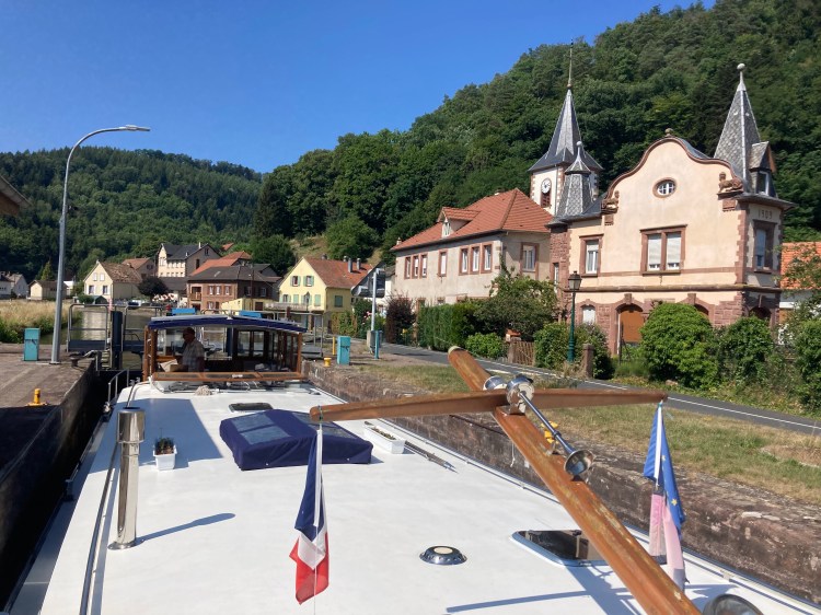 Both boats were on their way to Saverne for the night and our last lock as we entered town was a bit more of a challenge, both in turns of its structure (with a high sill at the top end) and the audience of ‘lunchers’ at the two restaurants alongside!