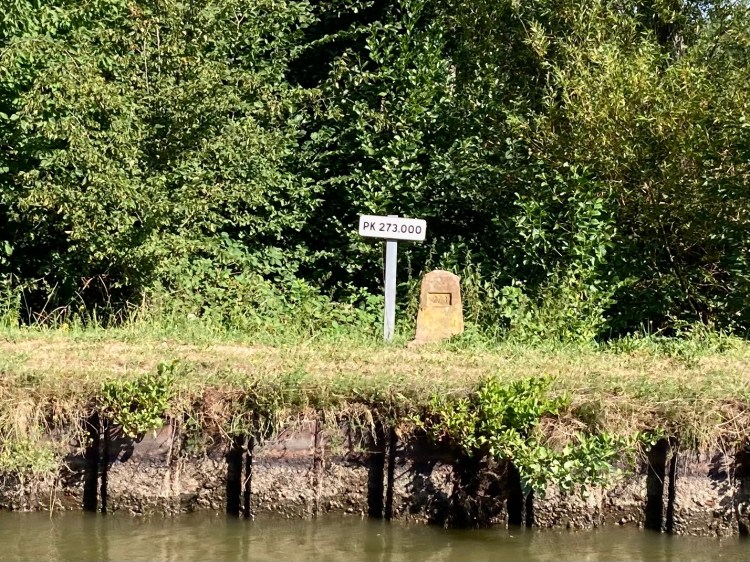 While I am mentioning canal side signs, here is a nice example of the old and new together – the old stone kilometre marker, and the new PK sign for the same point.