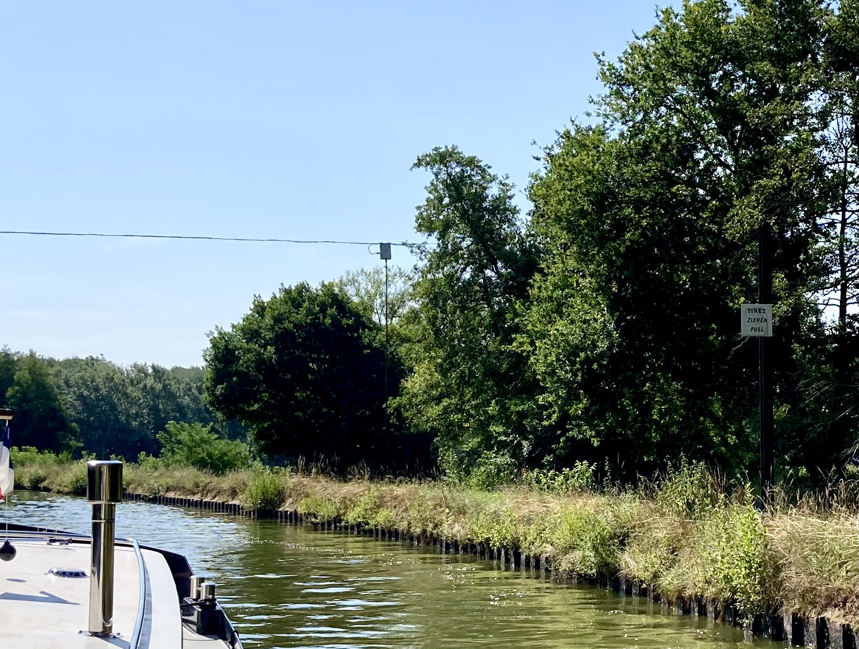 It was therefore lucky next day that we suddenly caught sight of a pole suspended above the water and in the shadow of the tree on the right a sign saying ‘Tirez Ziehen Pull’.