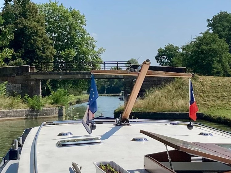One of the effects of the lack of water is that boaters are asked to share locks with other boats to save water. We were therefore expecting to share with the boat ahead of us, but they moored in the centre of the lock. Despite our polite calls in English and French they did not seem to understand so Captain ‘hove to’ and we prepared to wait our turn.