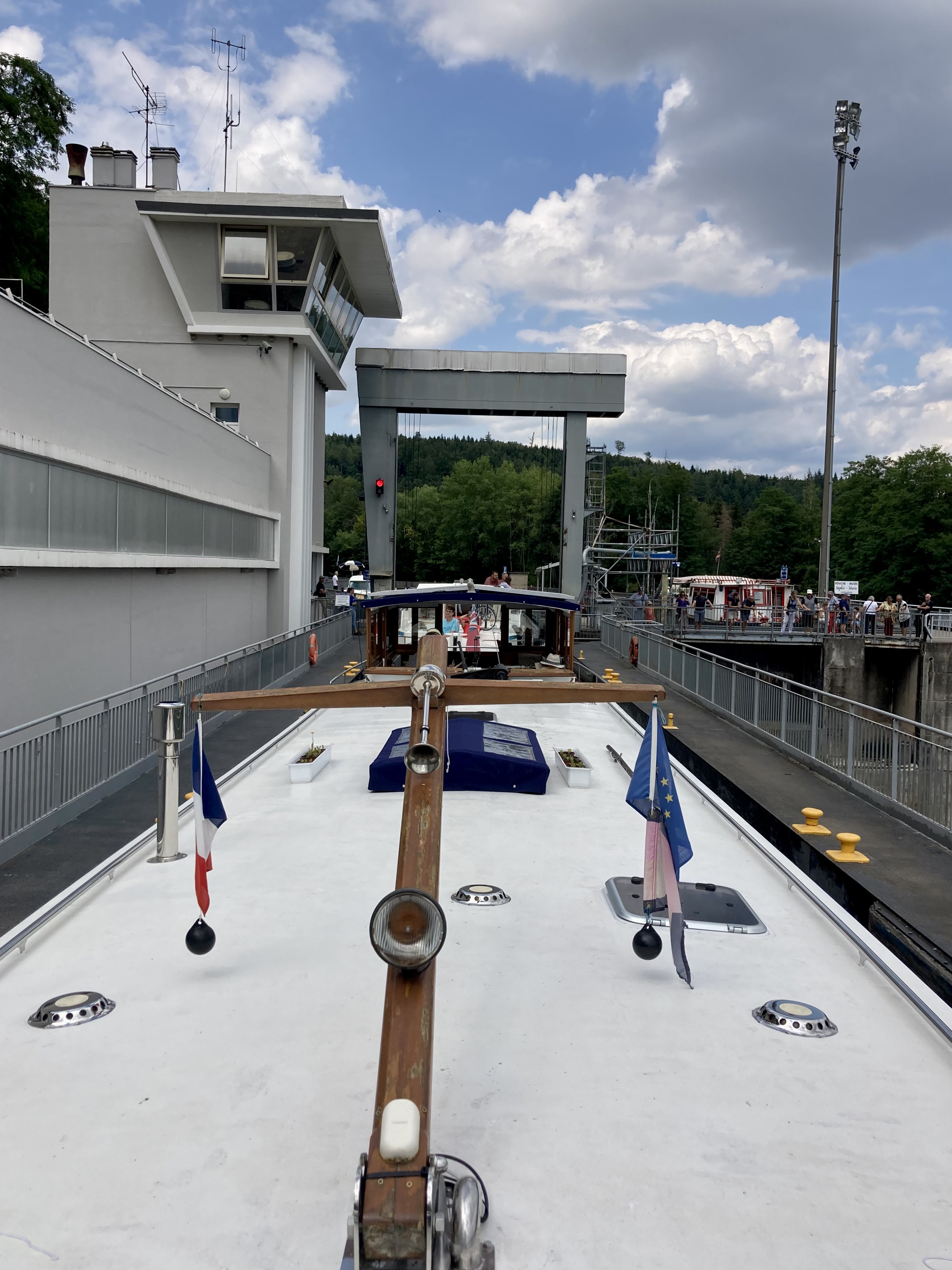 One of the effects of the lack of water is that boaters are asked to share locks with other boats to save water. We were therefore expecting to share with the boat ahead of us, but they moored in the centre of the lock. Despite our polite calls in English and French they did not seem to understand so Captain ‘hove to’ and we prepared to wait our turn.