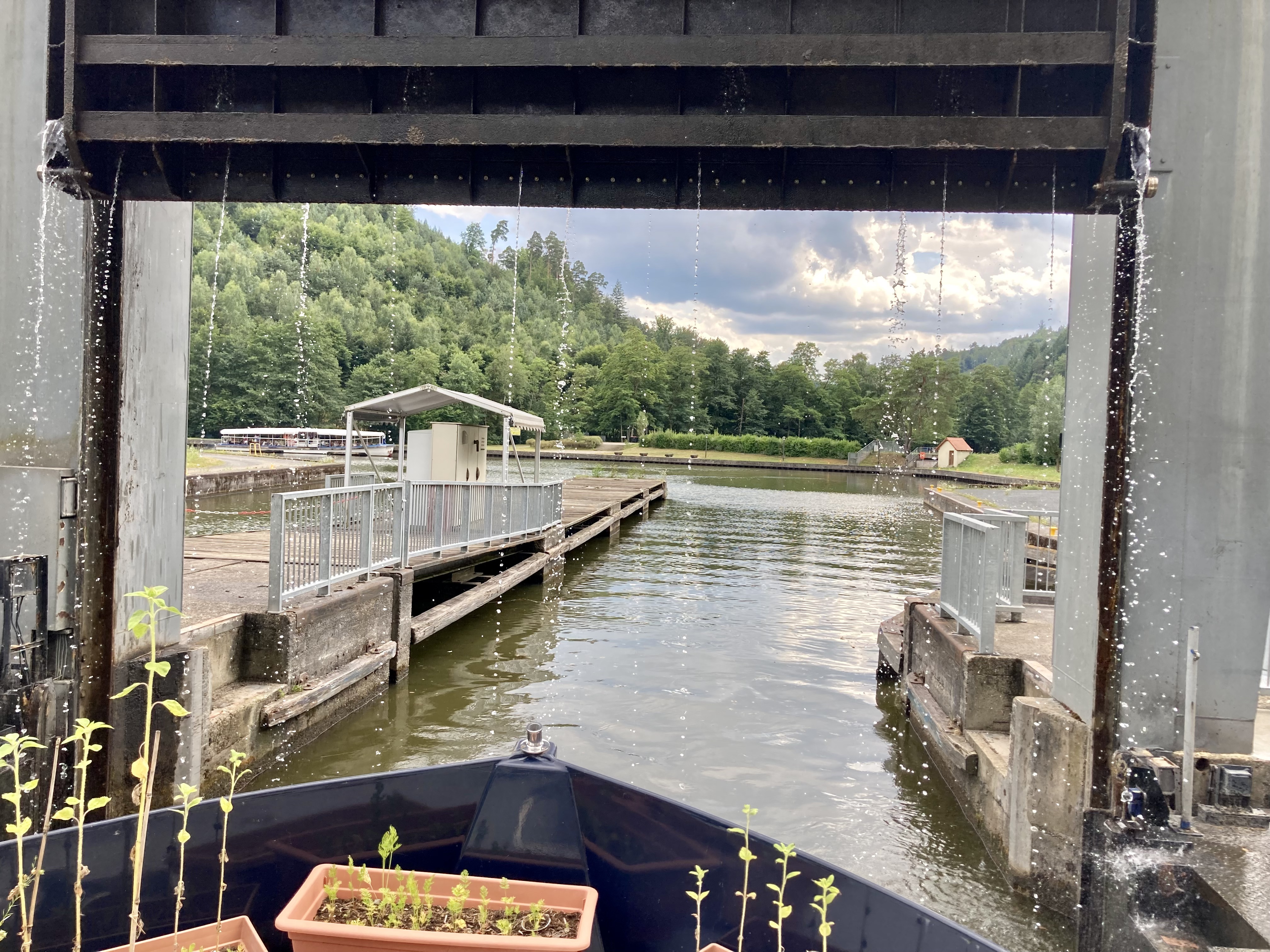 Both boats were on their way to Saverne for the night and our last lock as we entered town was a bit more of a challenge, both in turns of its structure (with a high sill at the top end) and the audience of ‘lunchers’ at the two restaurants alongside!