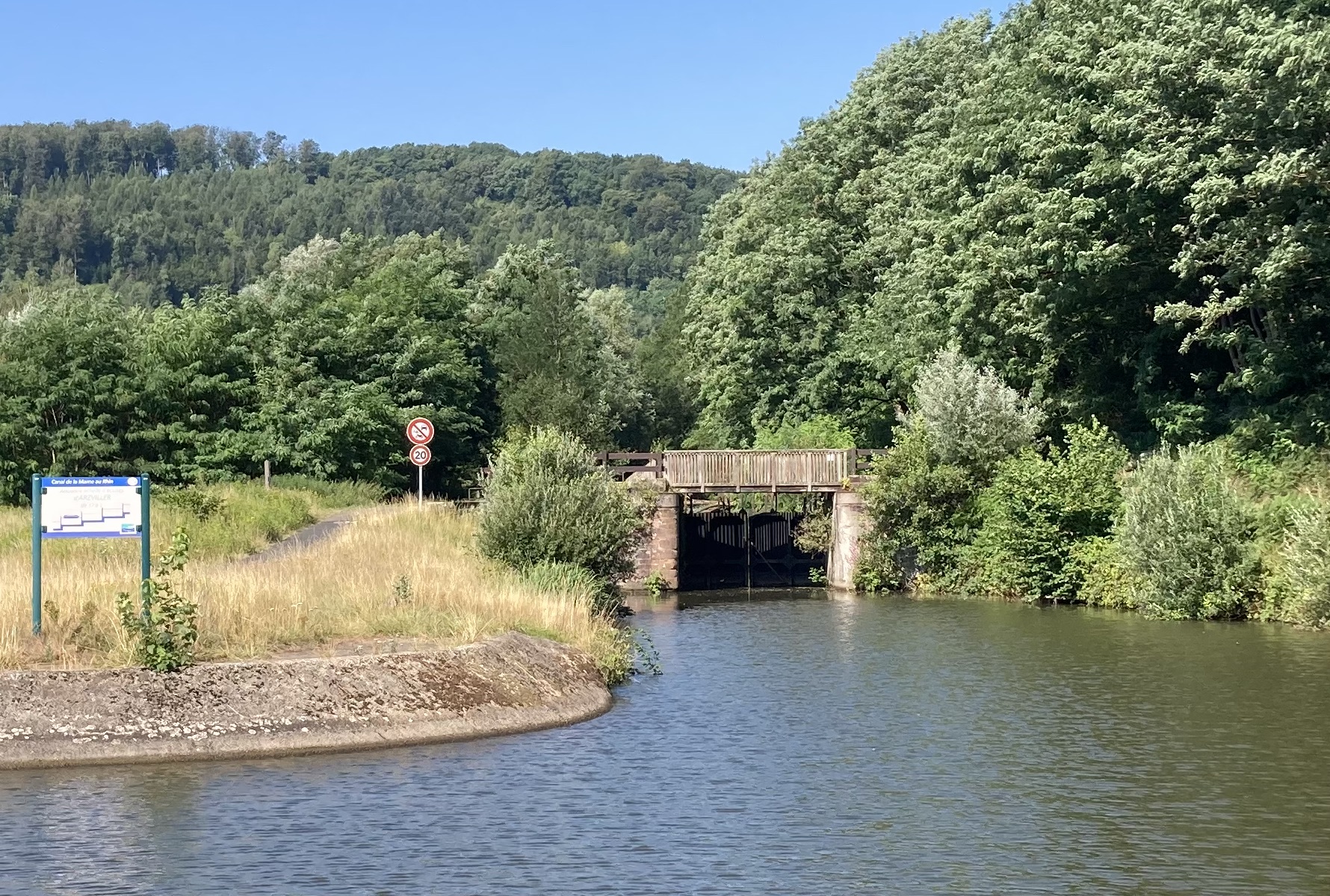 The first interesting thing we passed next morning was the entrance to the first of the 17 locks mentioned above. We have heard that the walk up past these old locks is well worth doing, but with our need to get to Strasbourg we could not stop this time.